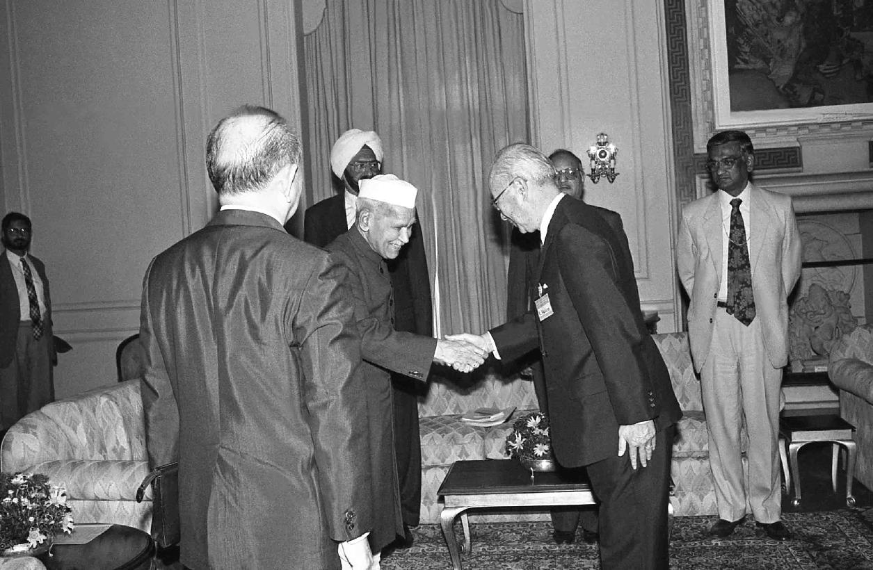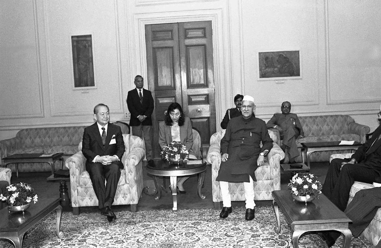 | Caption: | The members of Japan's Economic Mission led by Mr. Eme Yamashita, Chairman of the Indo-Japanese Business Cooperation Committee calling on the President of India, Dr. Shankar Dayal Sharma, at Rashtrapati Bhavan in New Delhi on March 08, 1994. |