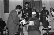 | Caption: | The President of India, Dr. Shankar Dayal Sharma receiving a copy of the book "Yatharth Geeta" from Swami Adgadanand with others at Rashtrapati Bhavan in New Delhi on February 06, 1995. |