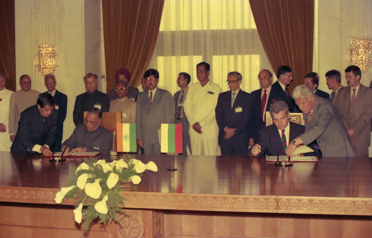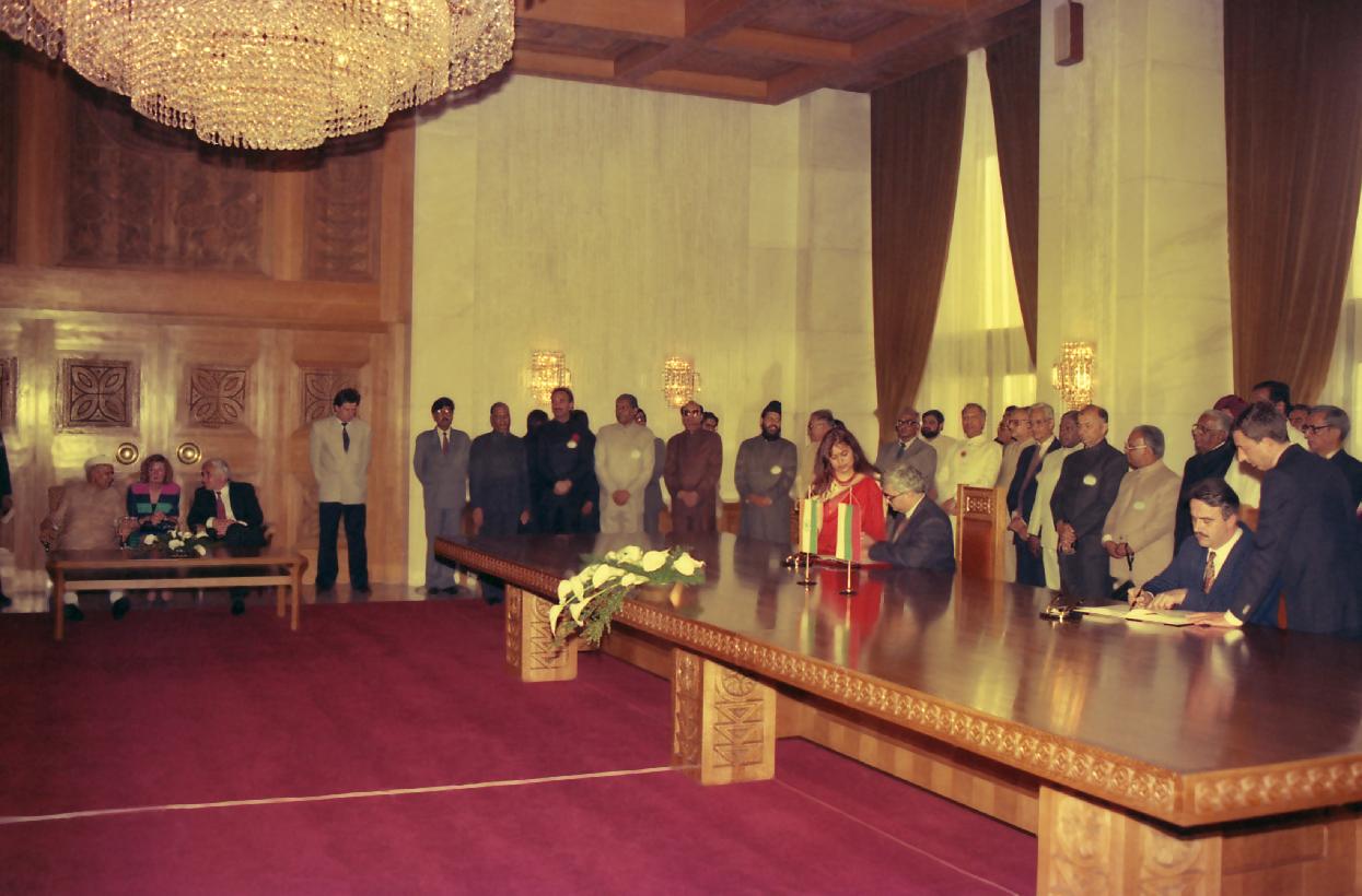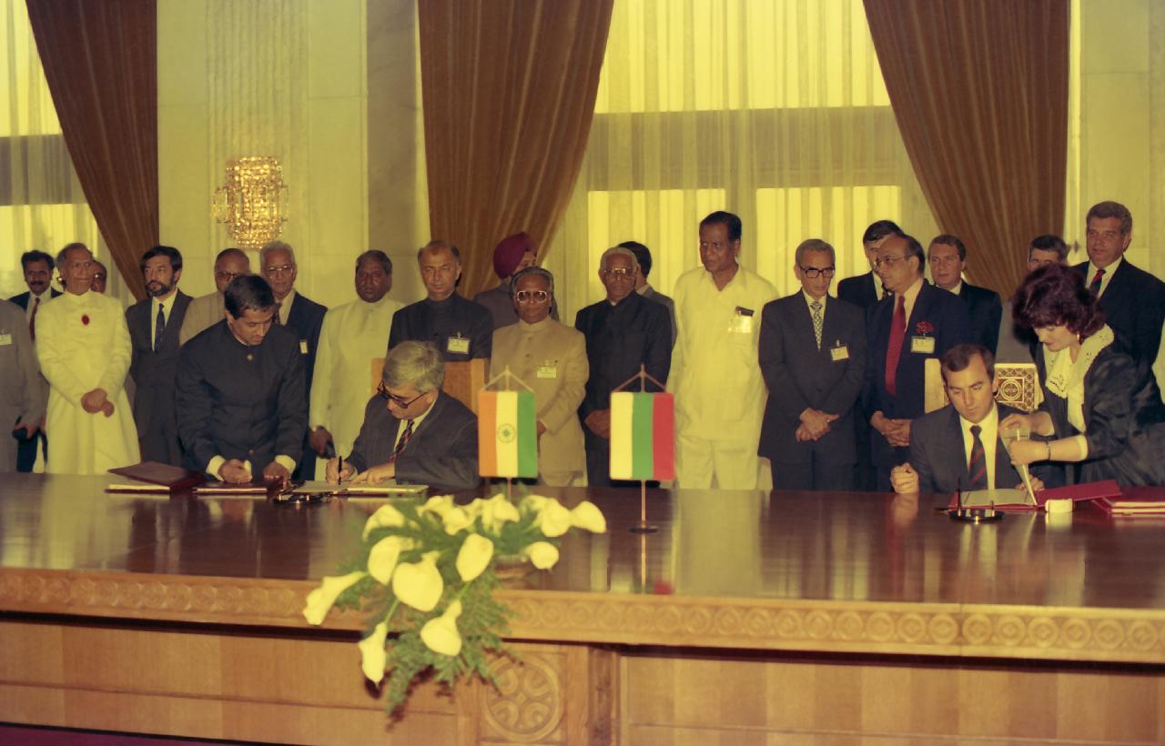 | Caption: | The President of India, Dr. Shankar Dayal Sharma and the President of Bulgaria, Mr. Zhelyu Zhelev, witnessing the signing of agreements, at Boyana, Sofia, in Bulgaria on May 26, 1994. |