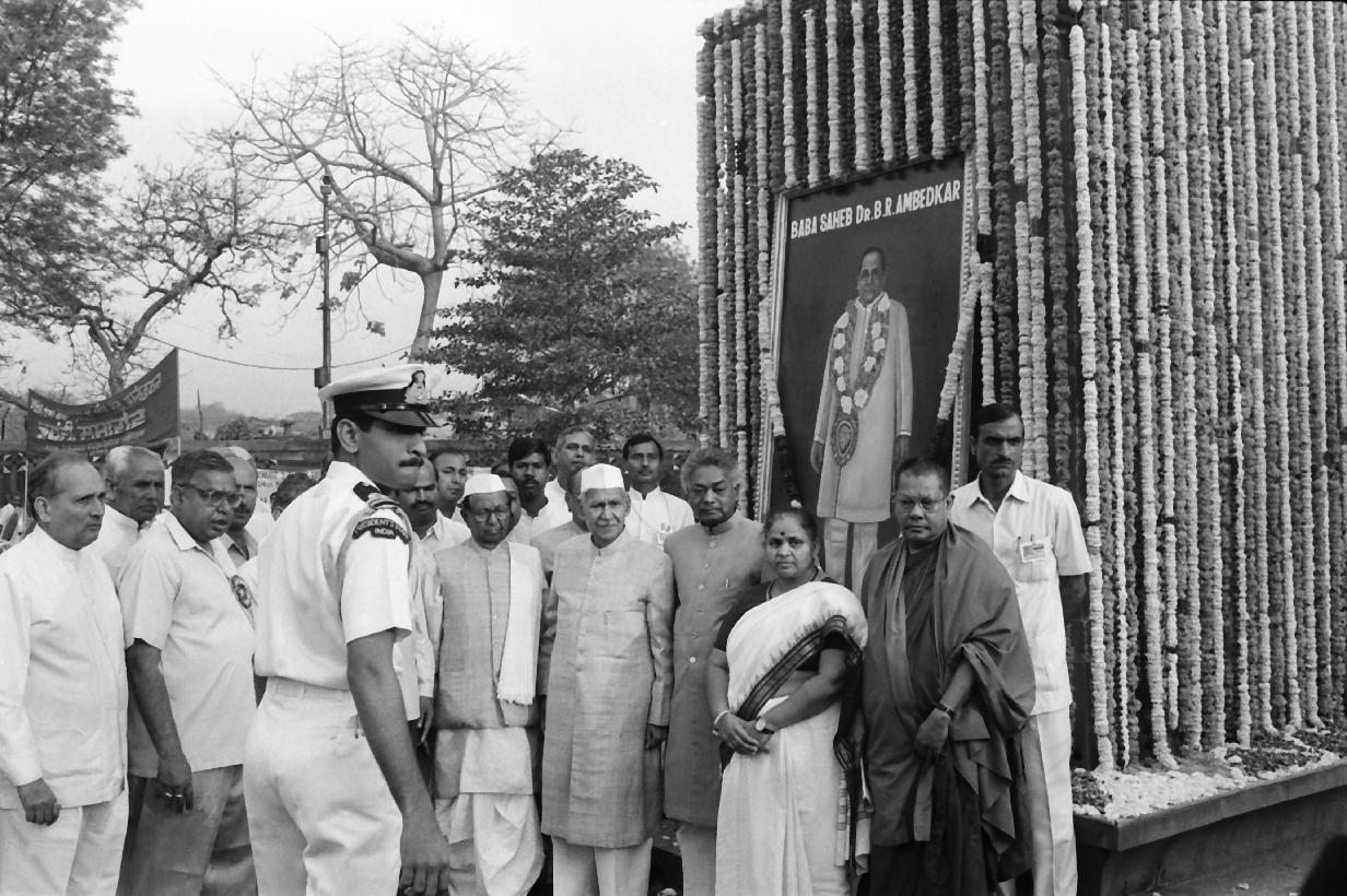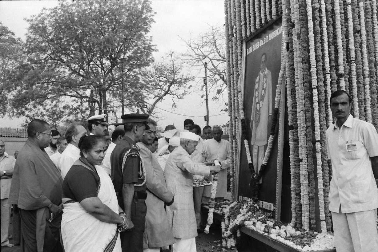 | Caption: | The President of India, Dr. Shankar Dayal Sharma paying floral tributes to Baba Saheb Dr. B.R. Ambedkar on the occasion of his 104th Birth Anniversary at Parliament House Lawns in New Delhi on April 14, 1995. |