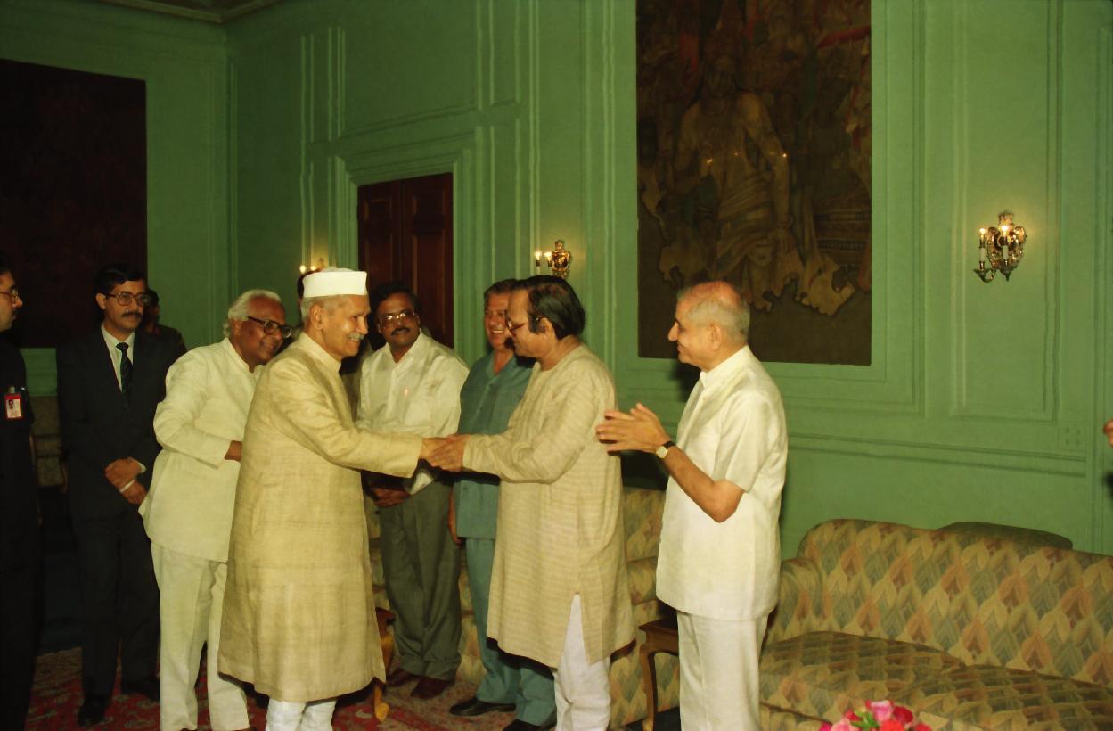 | Caption: | The President of India, Dr. Shankar Dayal Sharma receiving a copy of the book "Shudra Tapasvi" from Shri B.R. Narayan at Rashtrapati Bhavan in New Delhi on April 19, 1995. |