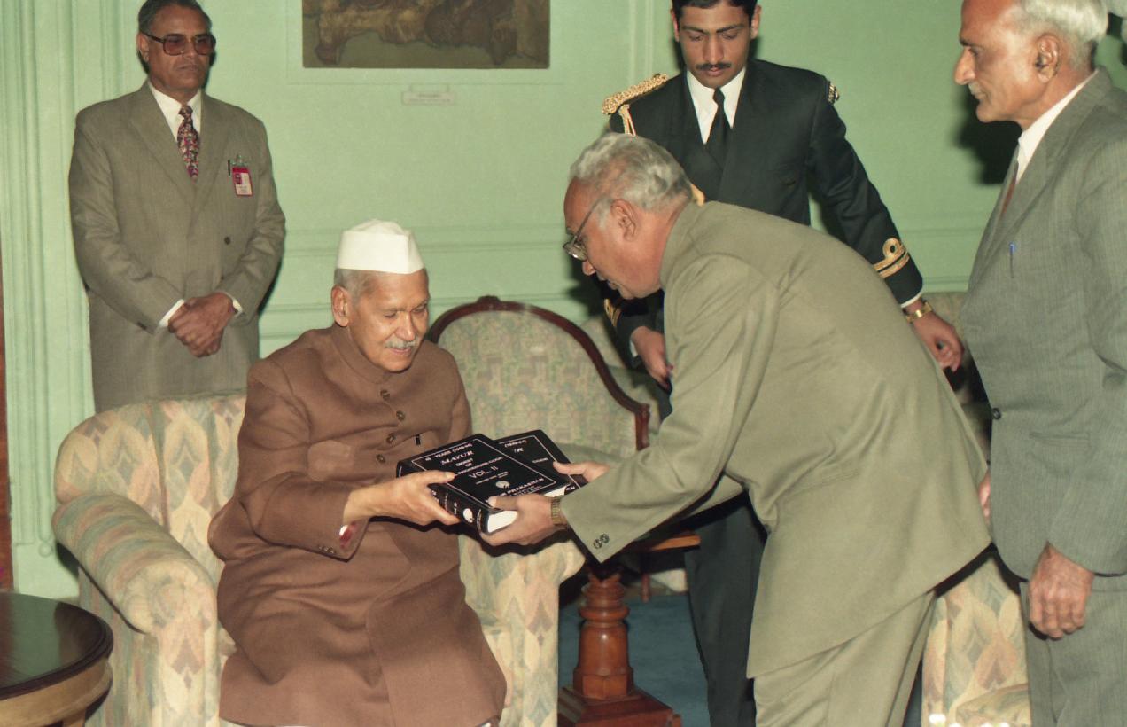 | Caption: | The President of India, Dr. Shankar Dayal Sharma receiving copies of the books "Mayur 45 Years Digest of Civil Procedure Code" and "Mayur 45 Years Defence Criminal Digest" from Shri Shri Shambhu Dayal Sharma, Advocate at Rashtrapati Bhavan in New Delhi on February 23, 1995. |