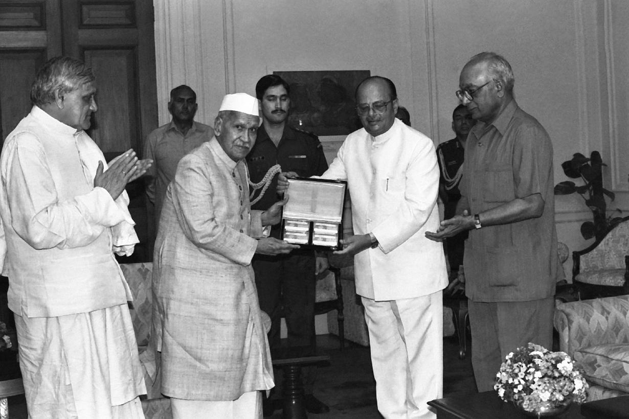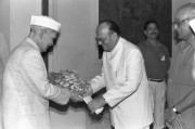 | Caption: | The President of India, Dr. Shankar Dayal Sharma receiving the first copy of the tape recording of Upanishads brought out by Shri Lal Bahadur Shastri Rashtriya Sanskrit Vidyapeeth at Rashtrapati Bhavan in New Delhi on May 20, 1994. |