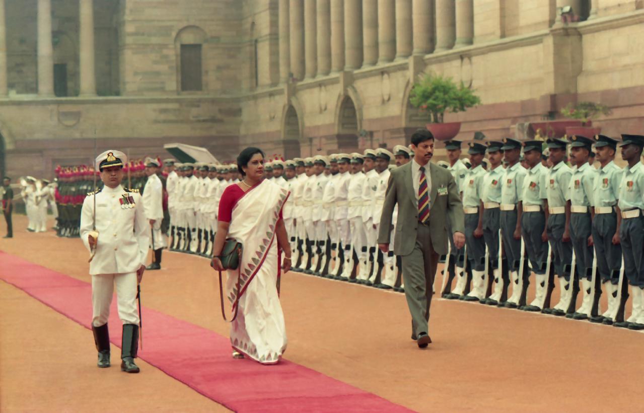 | Caption: | The President of India, Dr. Shankar Dayal Sharma receiving H.E. Mrs. Chandrika Bandaranaike Kumaratunga, President of the Democratic Socialist Republic of Sri Lanka, at her Ceremonial Reception, at Rashtrapati Bhavan in New Delhi on March 25, 1995. |