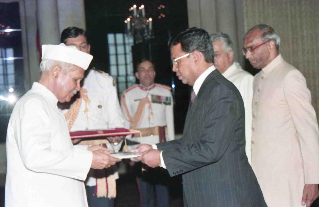 | Caption: | The High Commissioner-Designate of Bangladesh to India, H.E. Mr. C.M. Shafi Sami presenting his credentials to the President of India, Dr. Shankar Dayal Sharma at Rashtrapati Bhavan in New Delhi on April 21, 1995. |