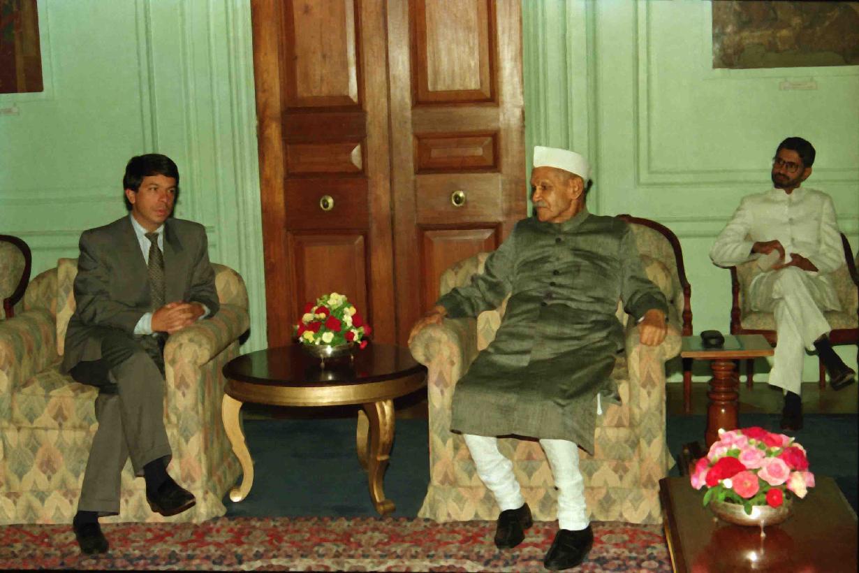 | Caption: | The President of India, Dr. Shankar Dayal Sharma meeting with H.E. Dr. Rorigo Pardo Garcia-Pena, Foreign Minister of Colombia at Rashtrapati Bhavan in New Delhi on April 21, 1995. |