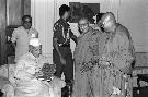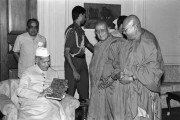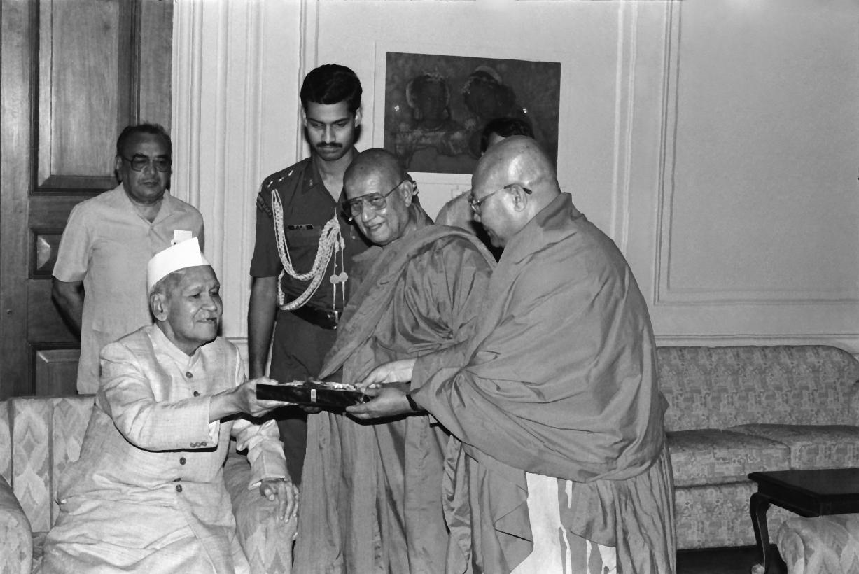| Caption: | The President of India, Dr. Shankar Dayal Sharma receiving a copy of the book "Vinay Pitaka" (Hindi translation by Pt. Rahul Sankrityayan) from Ven. Dhammaviriyo, Member, National Commission for Minorities at Rashtrapati Bhavan in New Delhi on April 24, 1995. |