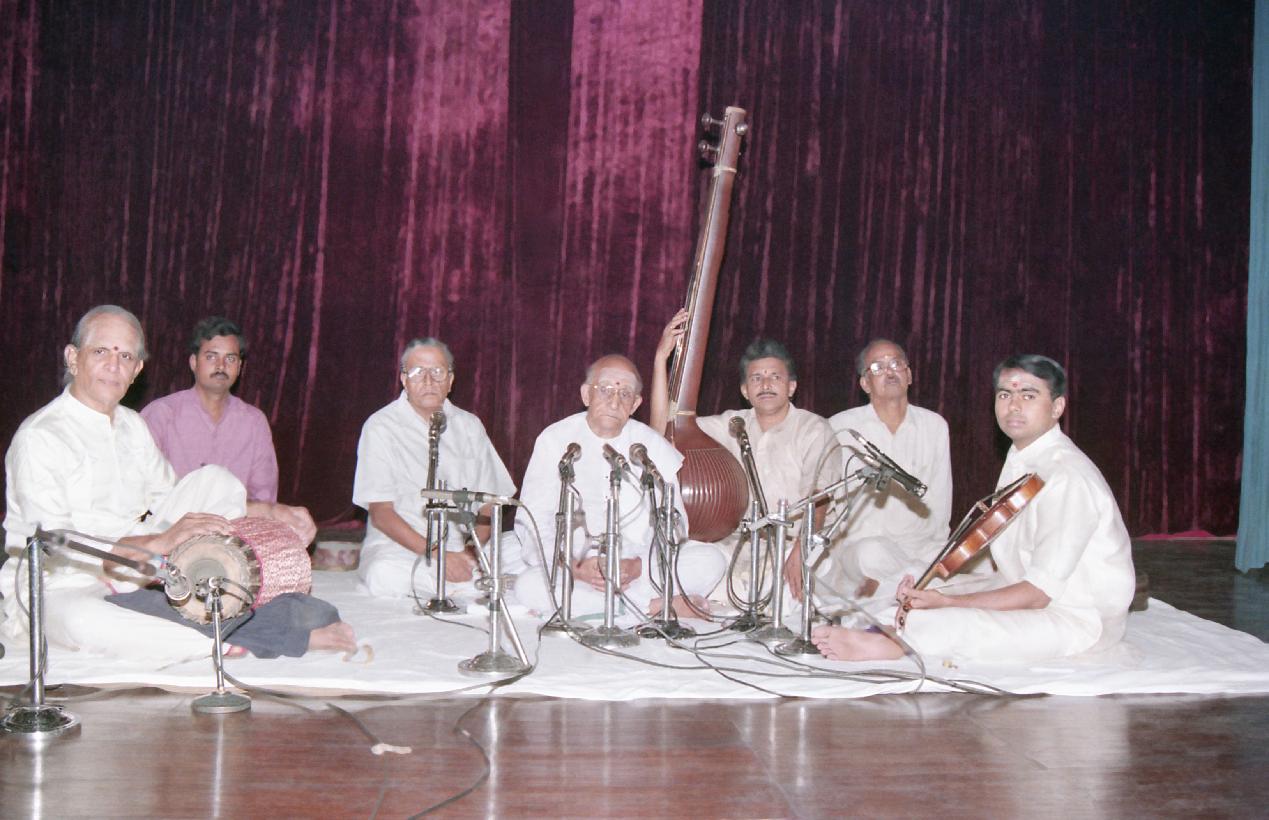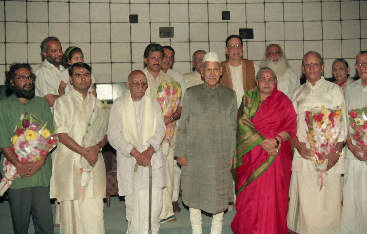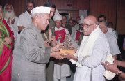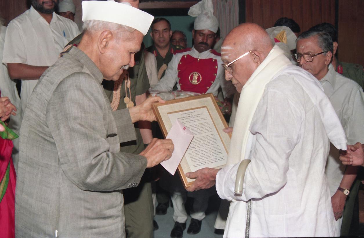 | Caption: | The President of India, Dr. Shankar Dayal Sharma presenting the Swaralaya Puraskaram to Padma Vibhushan Semmangudy R. Sreenivasa Iyyer and witnessing "Carnatic Vocal Recital" by him at Rashtrapati Bhavan in New Delhi on April 25, 1995. |