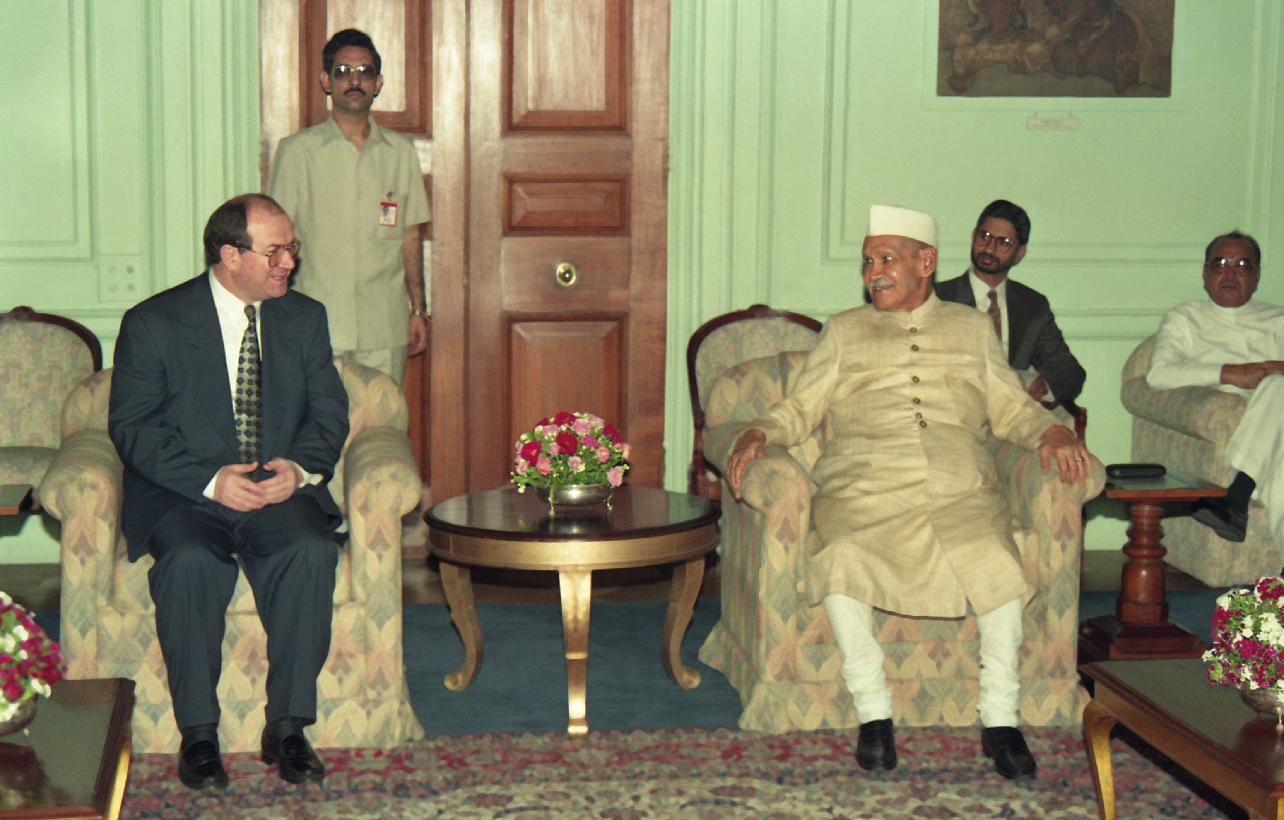 | Caption: | The Minister of External Affairs of Croatia, H.E. Dr. Mate Granic calling on the President of India, Dr. Shankar Dayal Sharma, at Rashtrapati Bhavan in New Delhi on April 28, 1995. |