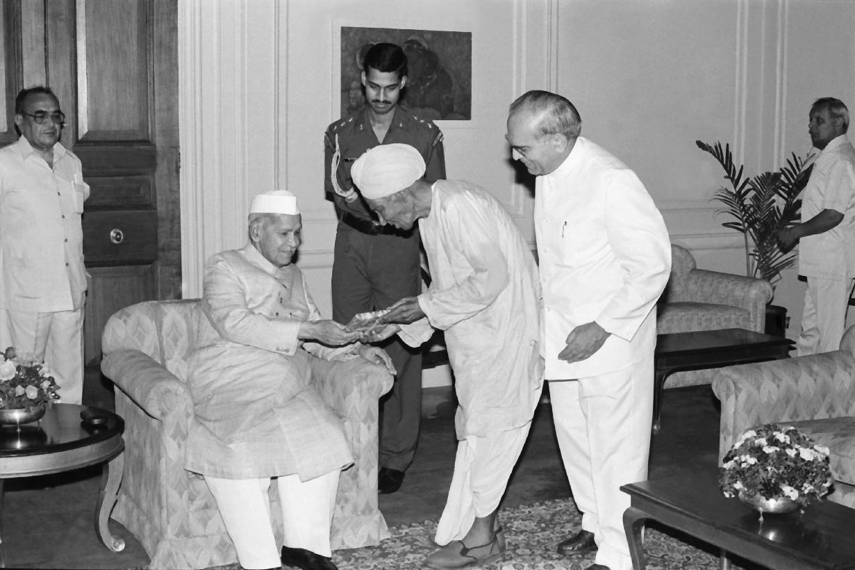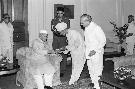 | Caption: | The President of India, Dr. Shankar Dayal Sharma receiving a copy of the book "Darshanamritam" from Shri Sadhu Ram Shastri at Rashtrapati Bhavan in New Delhi on April 29, 1995. |