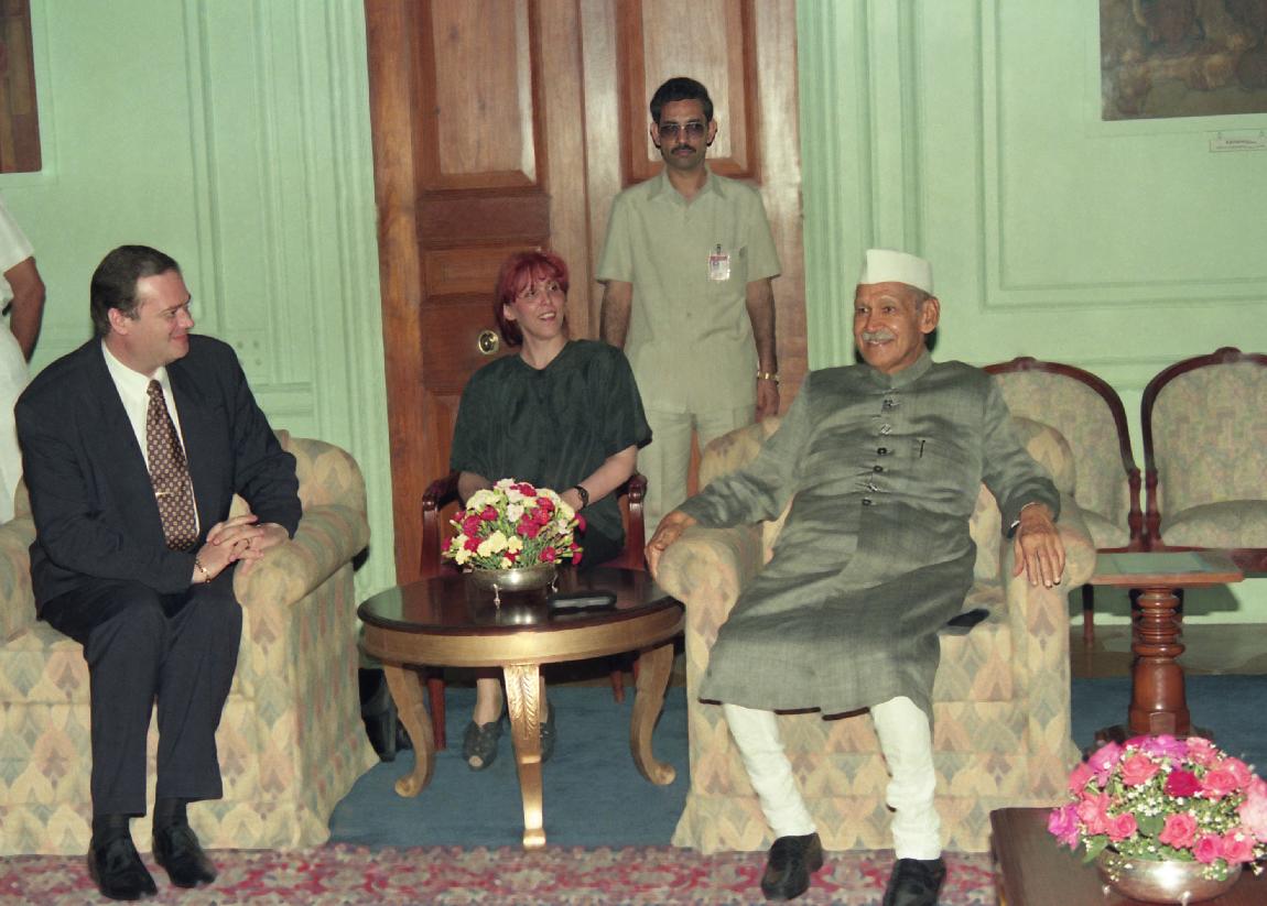 | Caption: | The Tourism Minister of Romania, H.E. Mr. Matei A. Dan and Mrs. Dan calling on the President of India, Dr. Shankar Dayal Sharma and Smt. Vimala Sharma, at Rashtrapati Bhavan in New Delhi on April 10, 1995. |