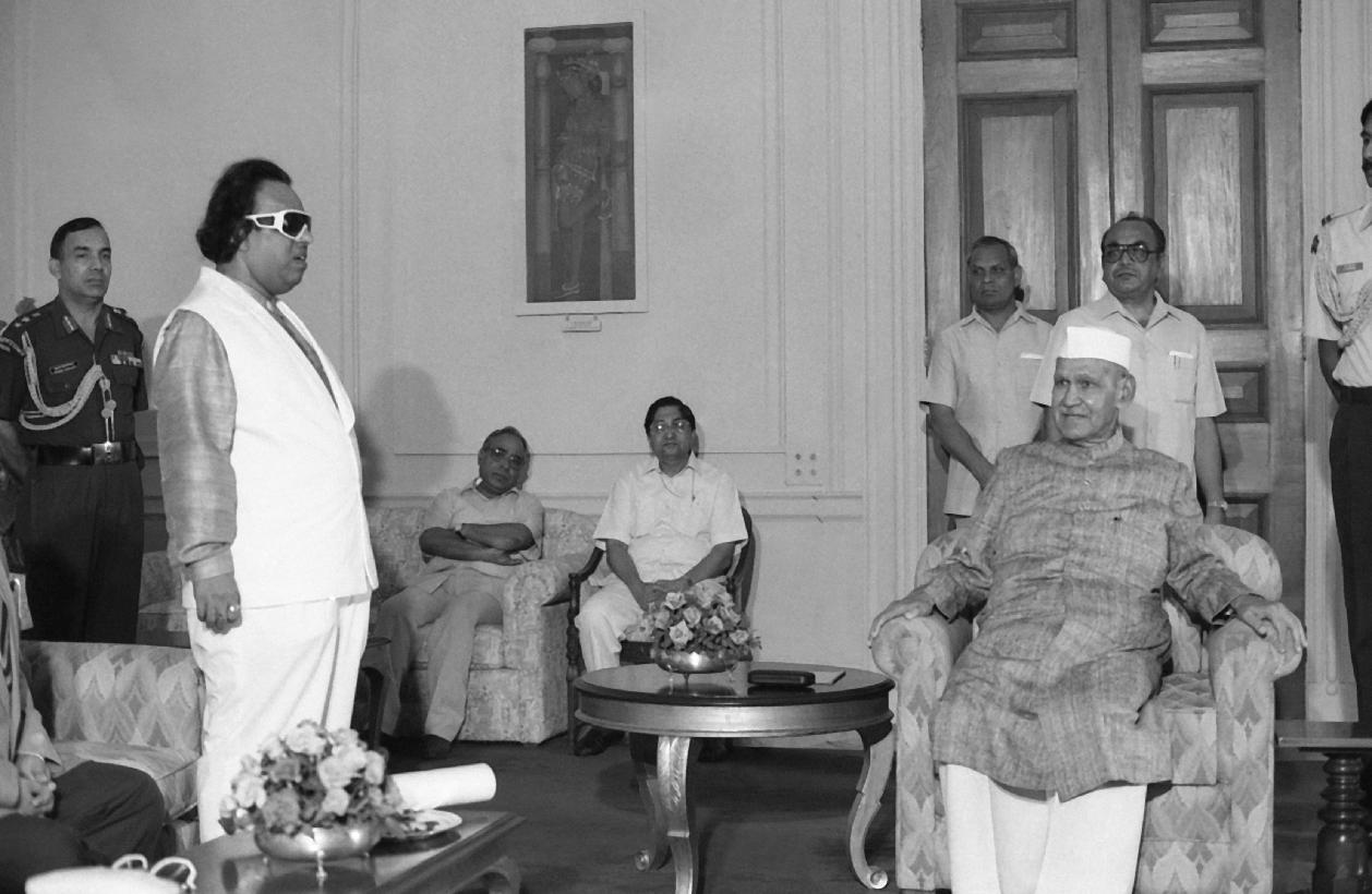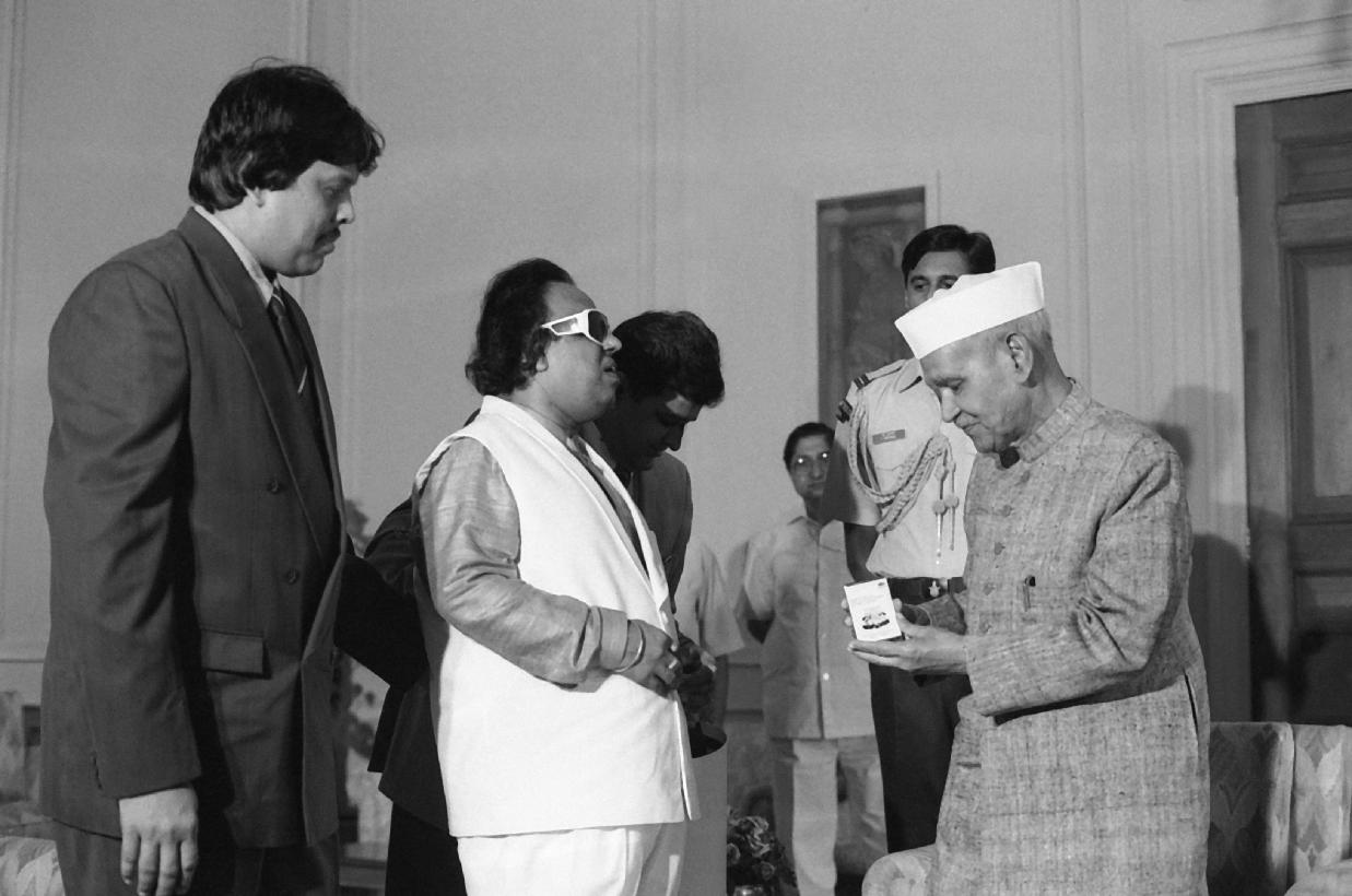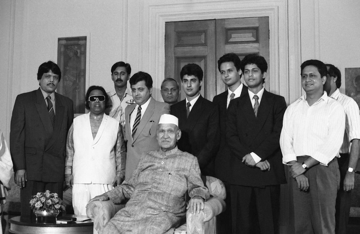 | Caption: | The President of India, Dr. Shankar Dayal Sharma receiving a copy of the music cassette of the film "Param Vir Chakra" of Ishaan films, Bombay at Rashtrapati Bhavan in New Delhi on July 14, 1994. |