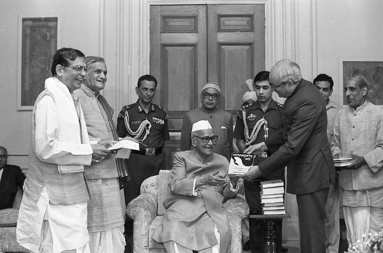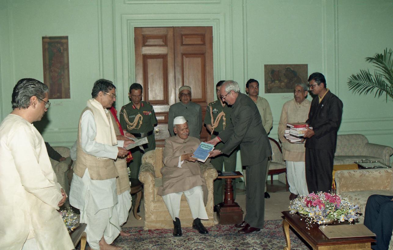 | Caption: | The President of India, Dr. Shankar Dayal Sharma receiving a set of books from the Governor of Uttar Pradesh, Shri Romesh Bhandari with others, at Rashtrapati Bhavan in New Delhi on March 10, 1997. |