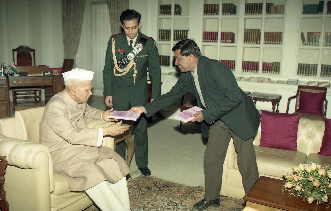 | Caption: | The President of India, Dr. Shankar Dayal Sharma receiving a copy of the book from Dr. Raveendra Kapur at Rashtrapati Bhavan in New Delhi on February 18, 1997. |