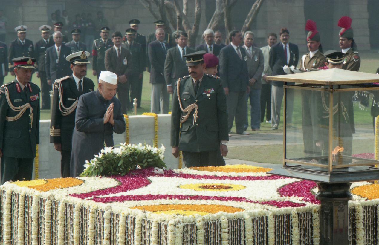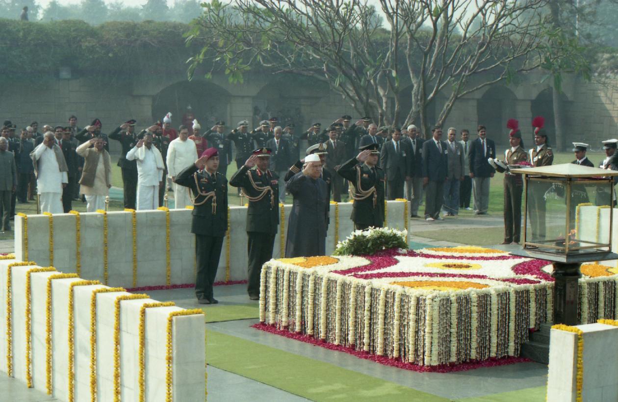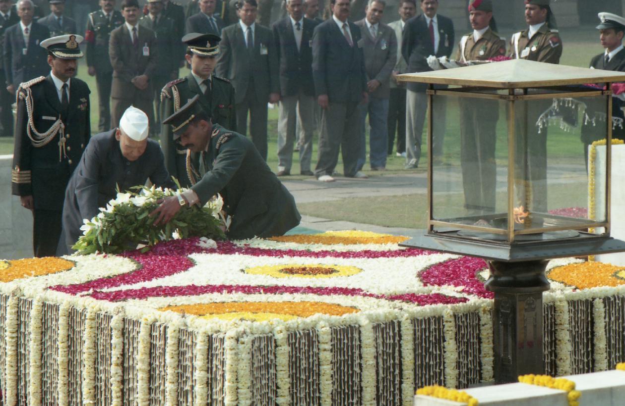 | Caption: | The President of India, Dr. Shankar Dayal Sharma paying Homage to Mahatma Gandhi, on Martyr's Day at Rajghat in Delhi on January 30, 1997. |