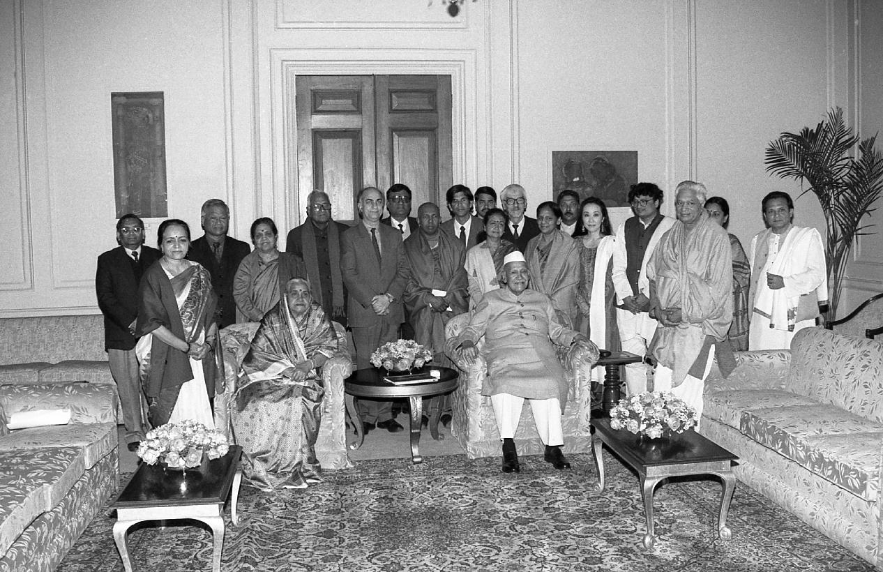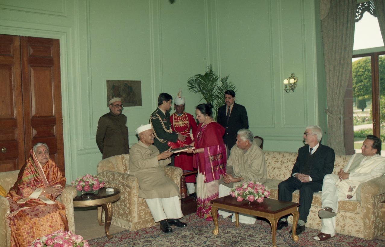 | Caption: | The President of India, Dr. Shankar Dayal Sharma receiving a copy of the book "Hindu Deities in Thai Art" from Smt. Gauri Devi at Rashtrapati Bhavan in New Delhi on February 06, 1997. |
