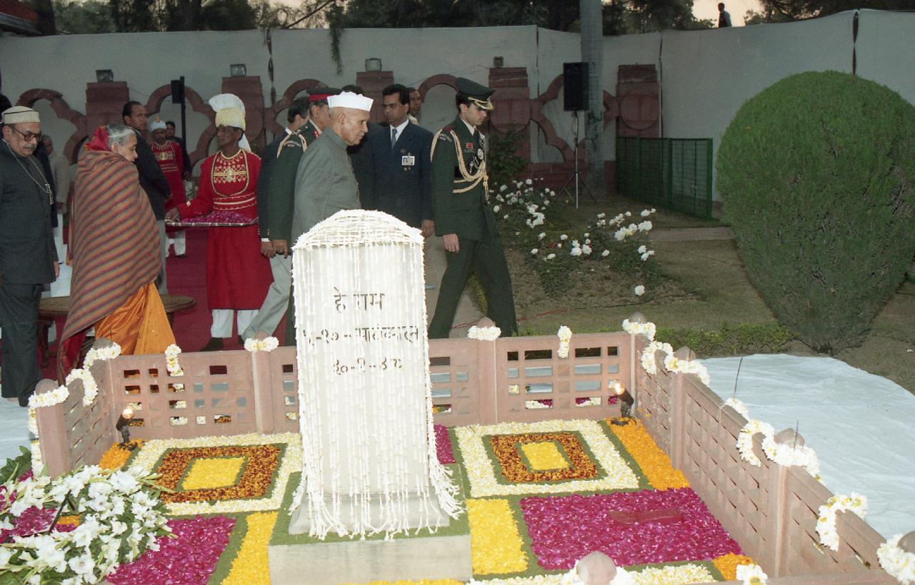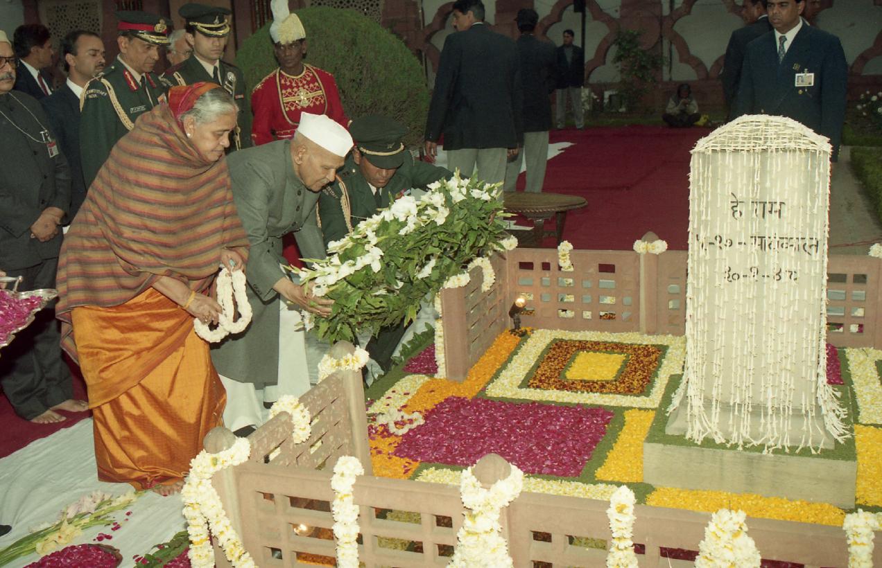 | Caption: | The President of India, Dr. Shankar Dayal Sharma paying floral tributes to Mahatma Gandhi on his Martyrdom Day, at Gandhi Smriti, in New Delhi on January 30, 1997. |