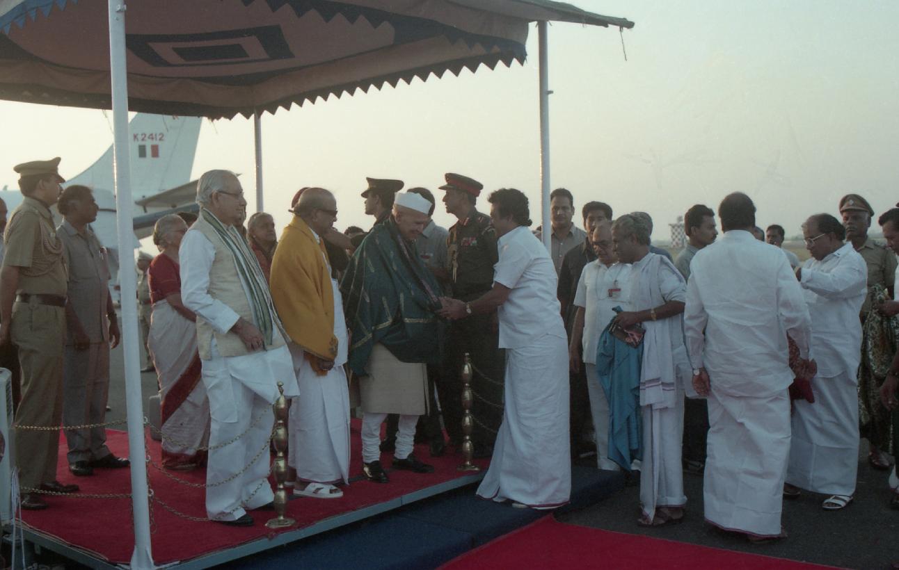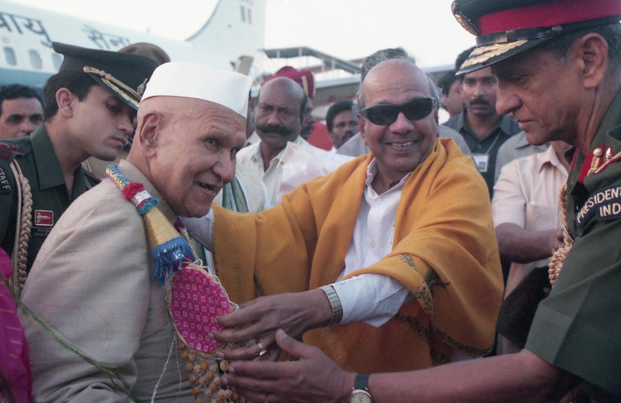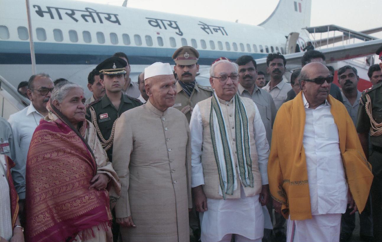 | Caption: | The President of India, Dr. Shankar Dayal Sharma and Smt. Vimala Sharma being received by the Governor of Tamil Nadu, Shri Krishan Kant and Chief Minister of Tamil Nadu, Shri M. Karunanidhi , at Thiruvaiyaru, in Tamil Nadu on January 20, 1997. |
