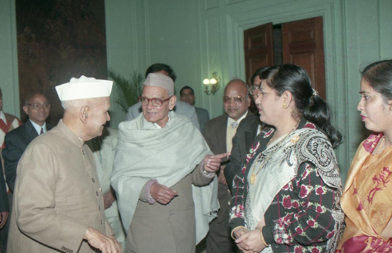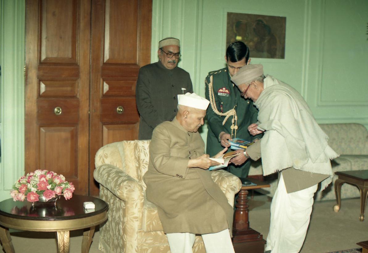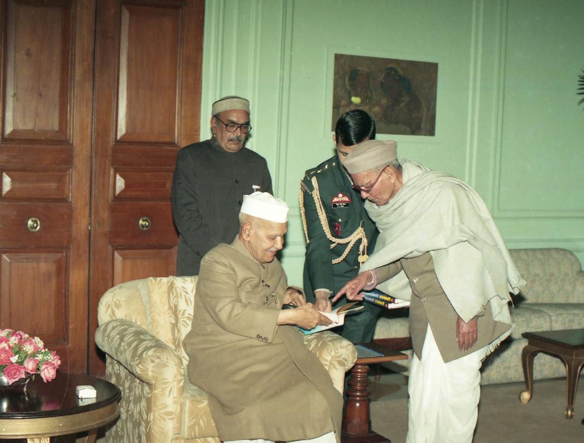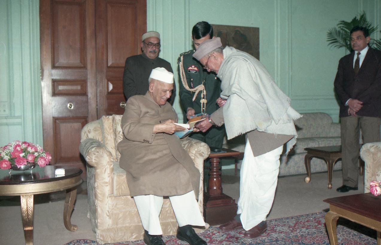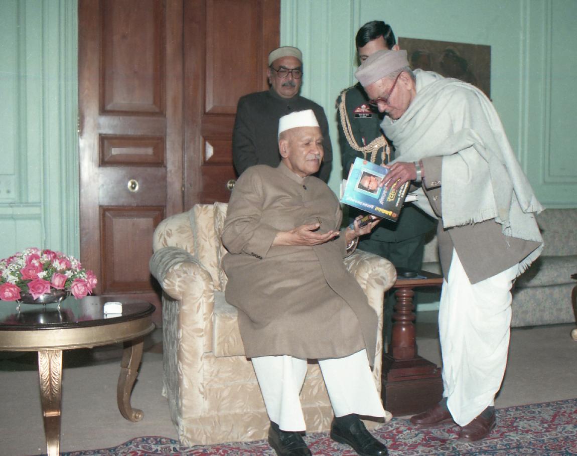| Caption: | The President of India, Dr. Shankar Dayal Sharma receiving a copy of the book "Dwarika Prasad Maheshwari Rachnawali" in three volumes from Dwarika Prasad Maheshwari at Rashtrapati Bhavan in New Delhi on February 04, 1997. |