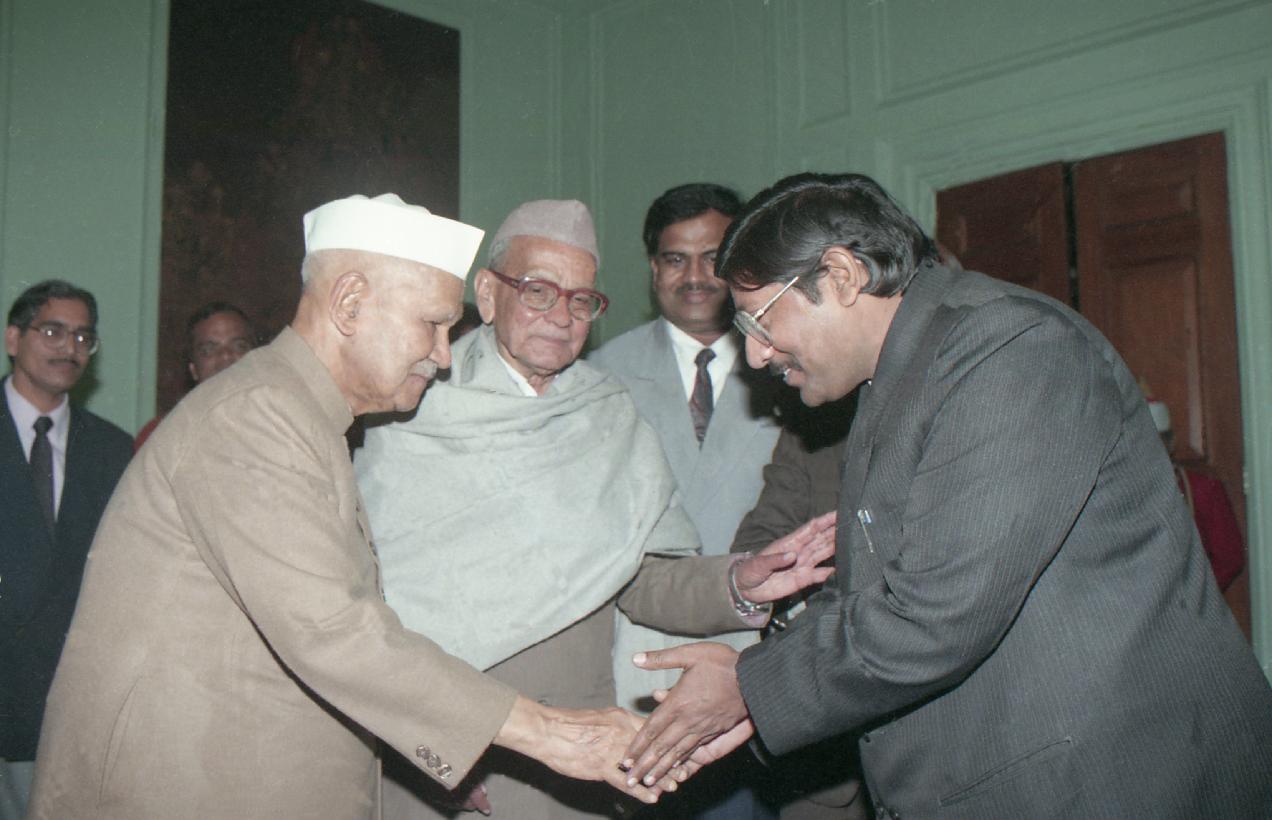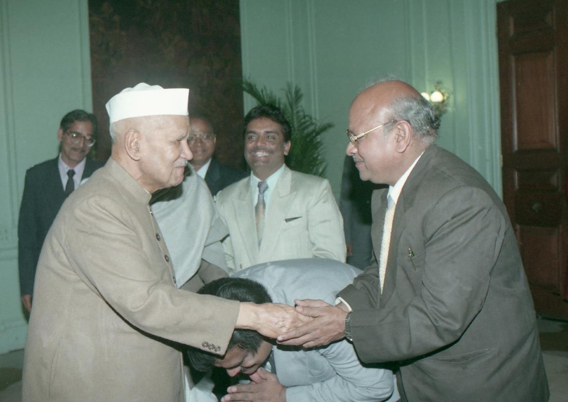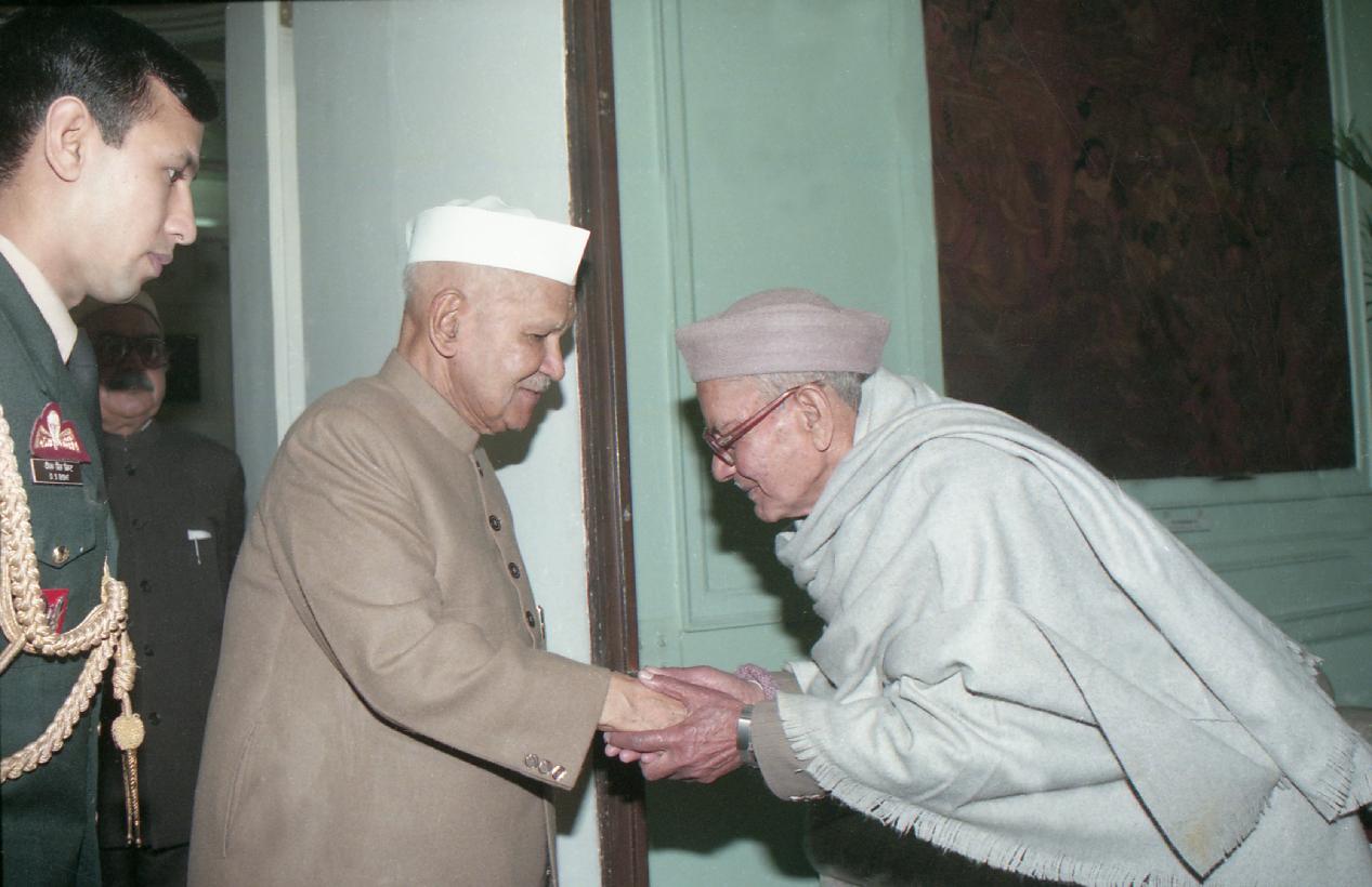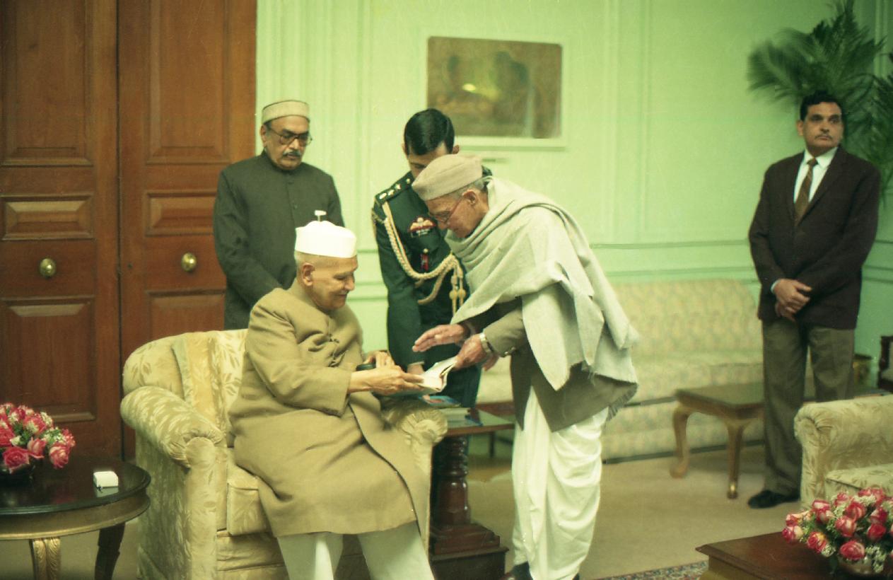 | Caption: | The President of India, Dr. Shankar Dayal Sharma receiving a copy of the book "Dwarika Prasad Maheshwari Rachnawali" in three volumes from Dwarika Prasad Maheshwari at Rashtrapati Bhavan in New Delhi on February 04, 1997. |