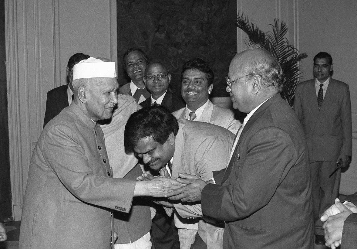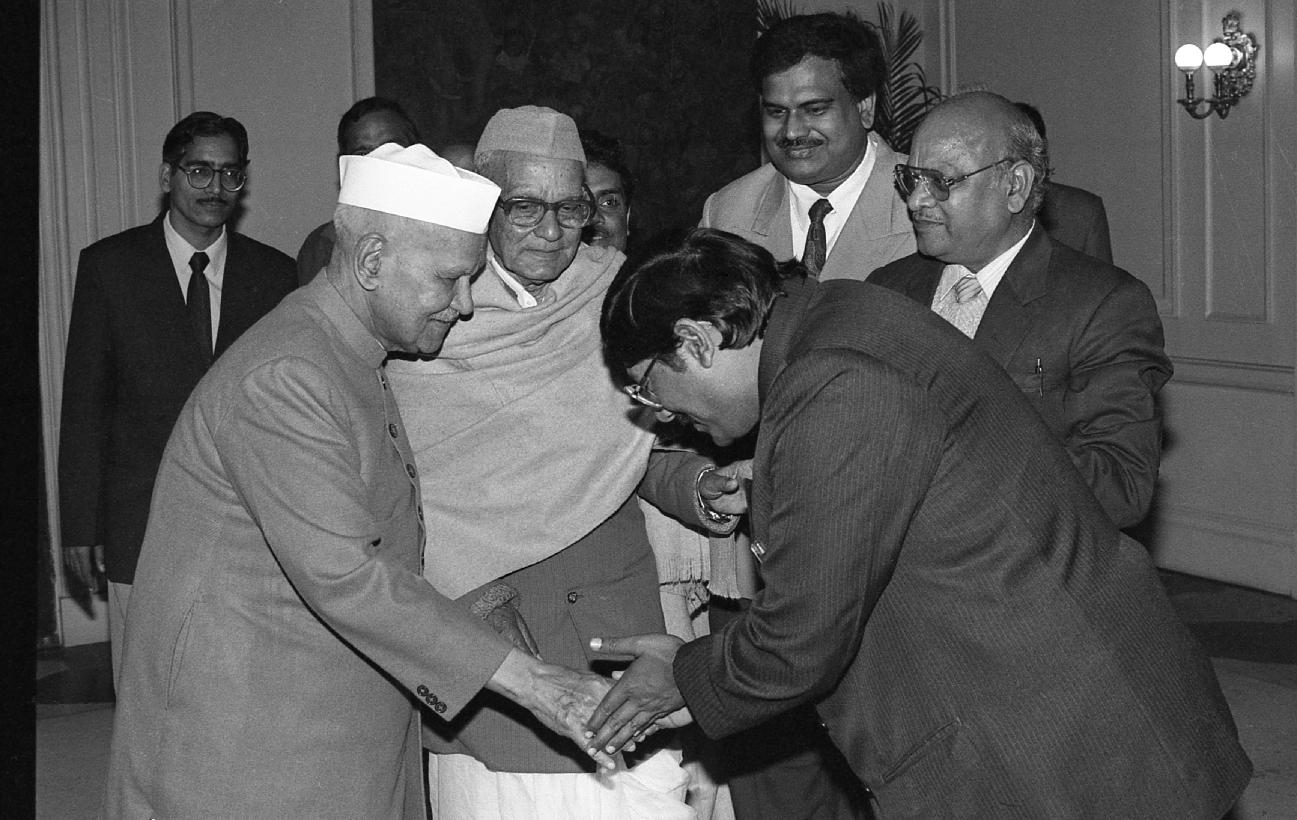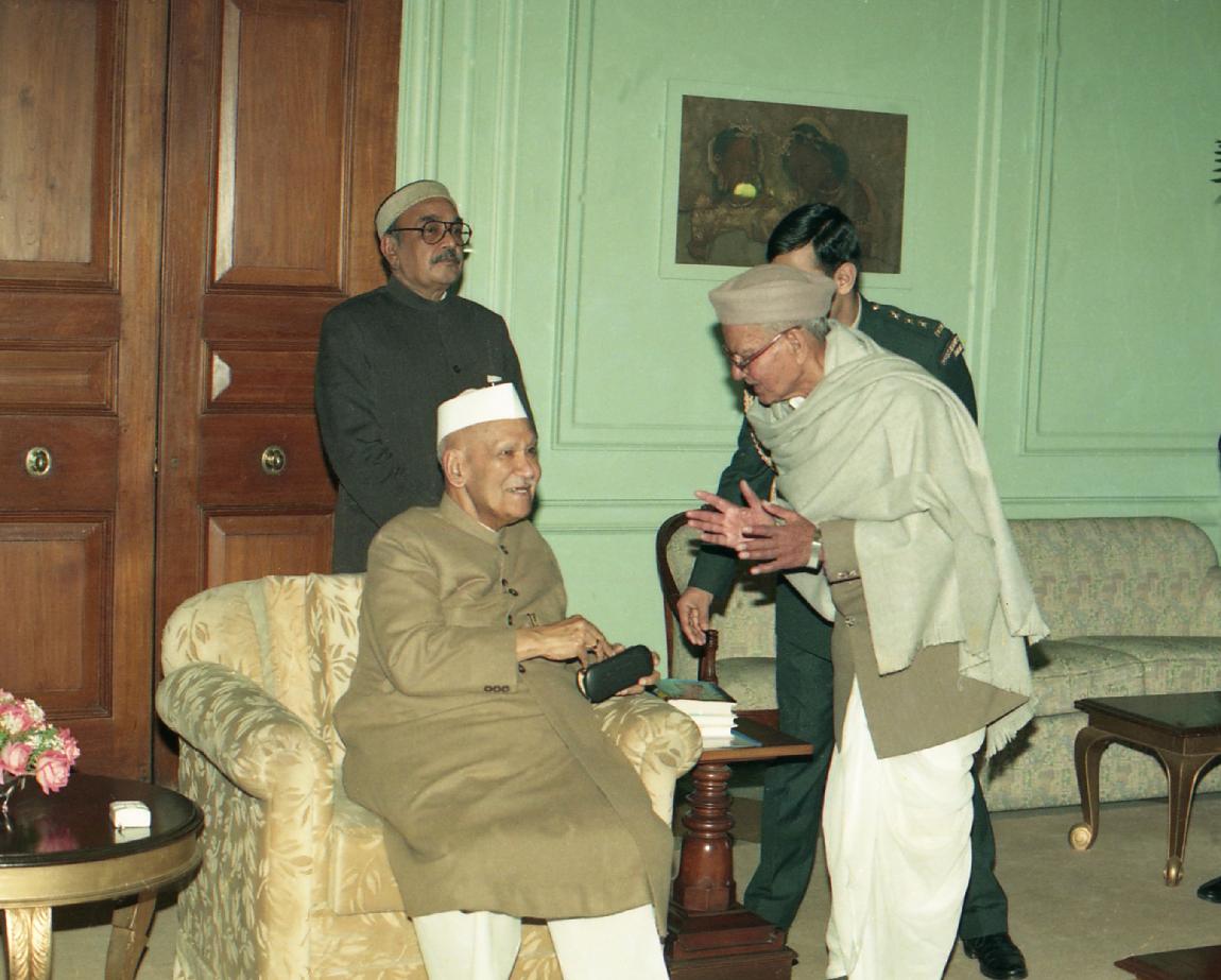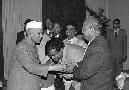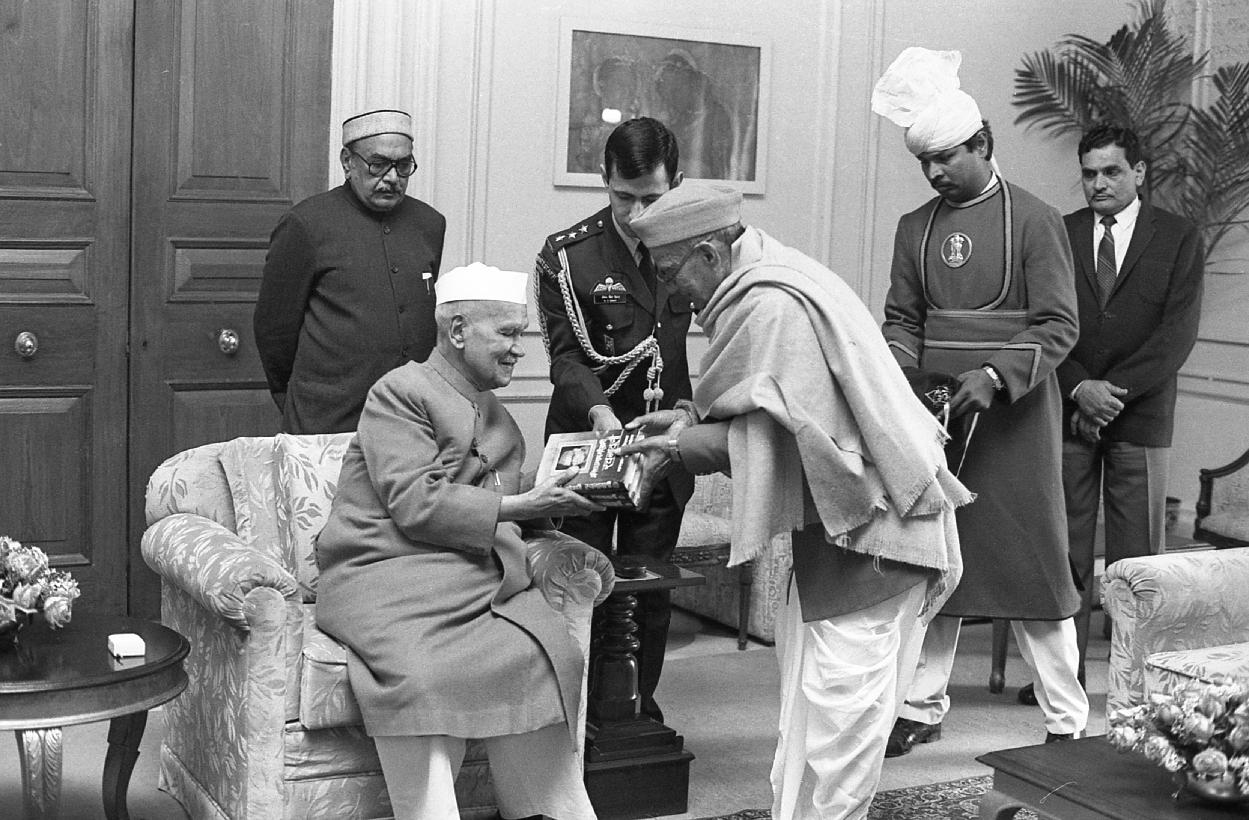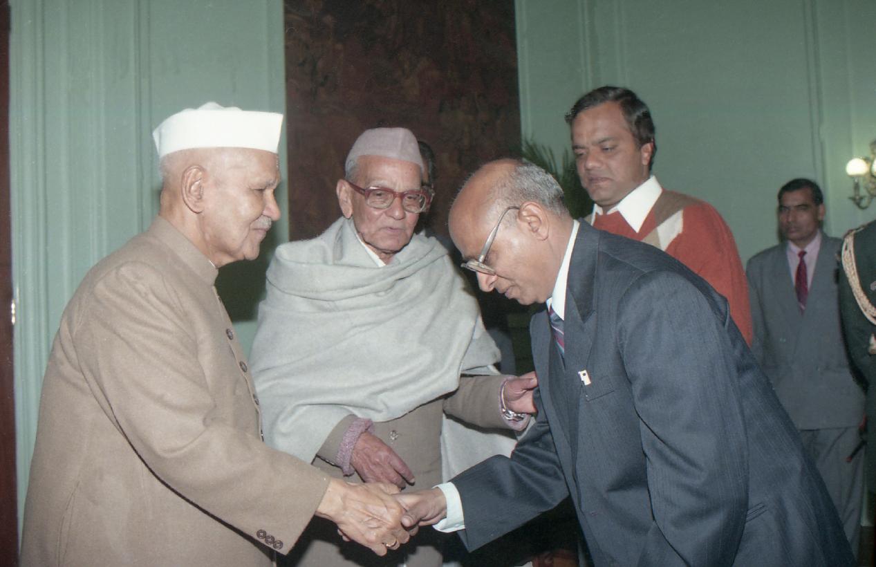 | Caption: | The President of India, Dr. Shankar Dayal Sharma receiving a copy of the book "Dwarika Prasad Maheshwari Rachnawali" in three volumes from Dwarika Prasad Maheshwari at Rashtrapati Bhavan in New Delhi on February 04, 1997. |