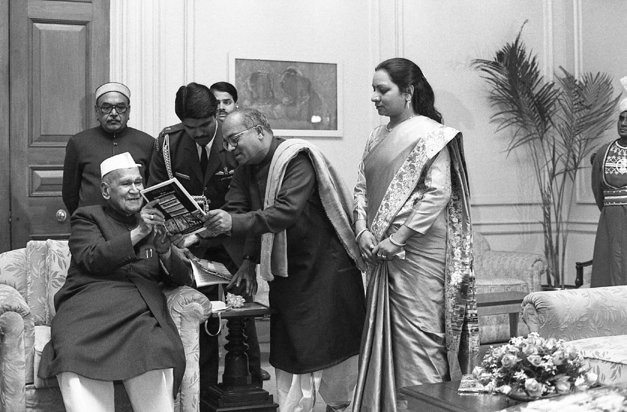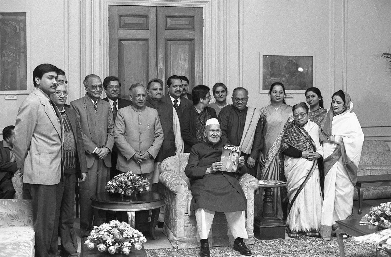 | Caption: | The President of India, Dr. Shankar Dayal Sharma receiving a copy of the First Edition of Hindi Magazine "Madhuri" of Chandra Prabha Publications from Ved Pratap Vaidik at Rashtrapati Bhavan in New Delhi on January 22, 1997. |