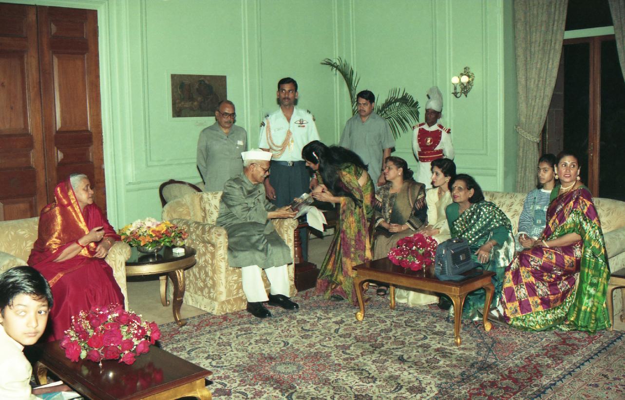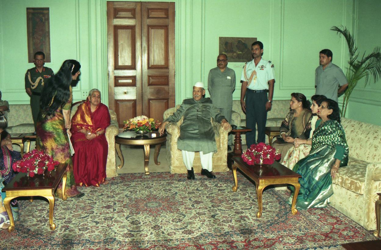 | Caption: | The President of India, Dr. Shankar Dayal Sharma receiving greetings on the occasion of Cheti Chand (Sindhi New Year) from "MARUEE" Social, Cultural & Literary Organisation of Sindhi Women at Rashtrapati Bhavan in New Delhi on April 08, 1997. |