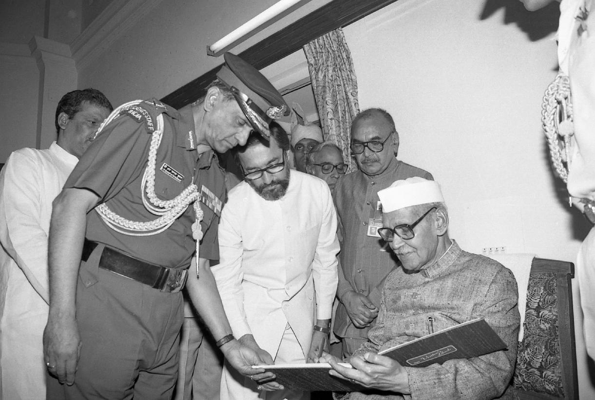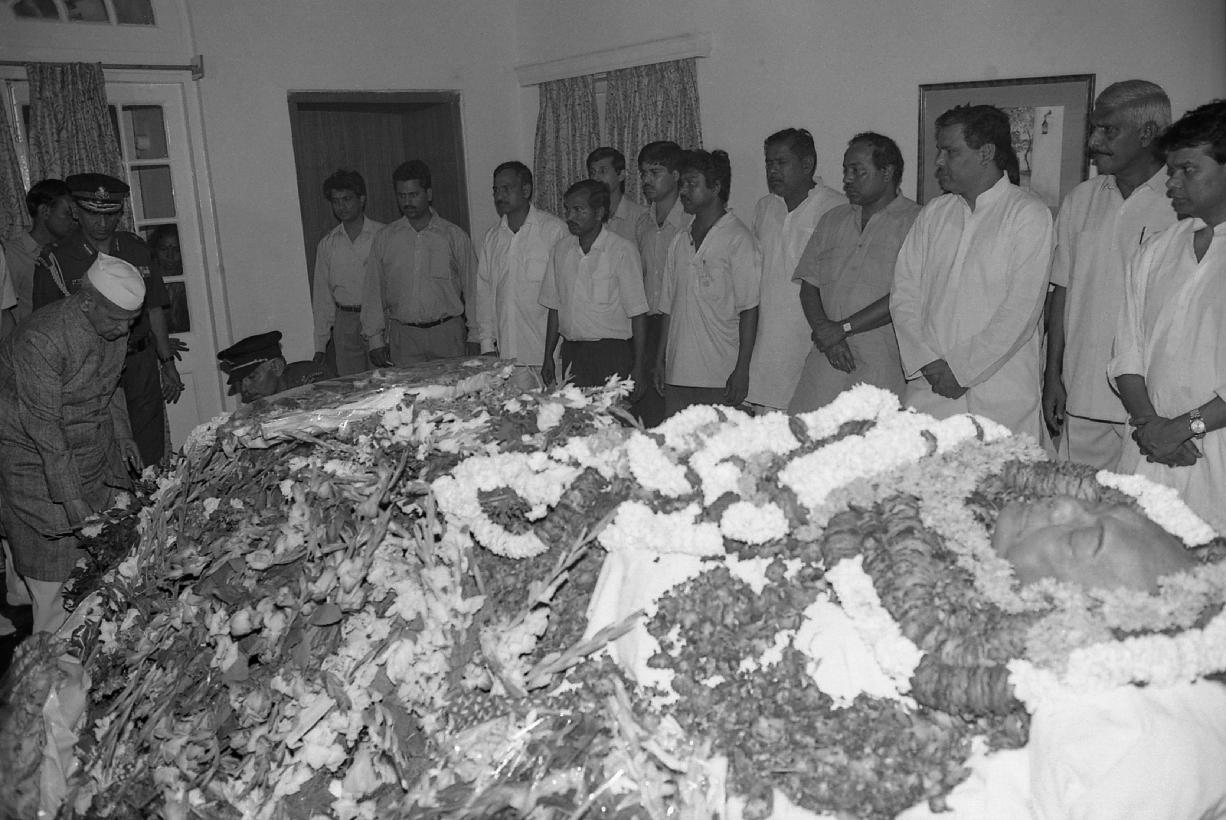 | Caption: | The President of India, Dr. Shankar Dayal Sharma laying wreath at the mortal remains of Shri Biju Patnaik, in New Delhi on April 17, 1997. |