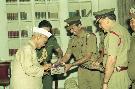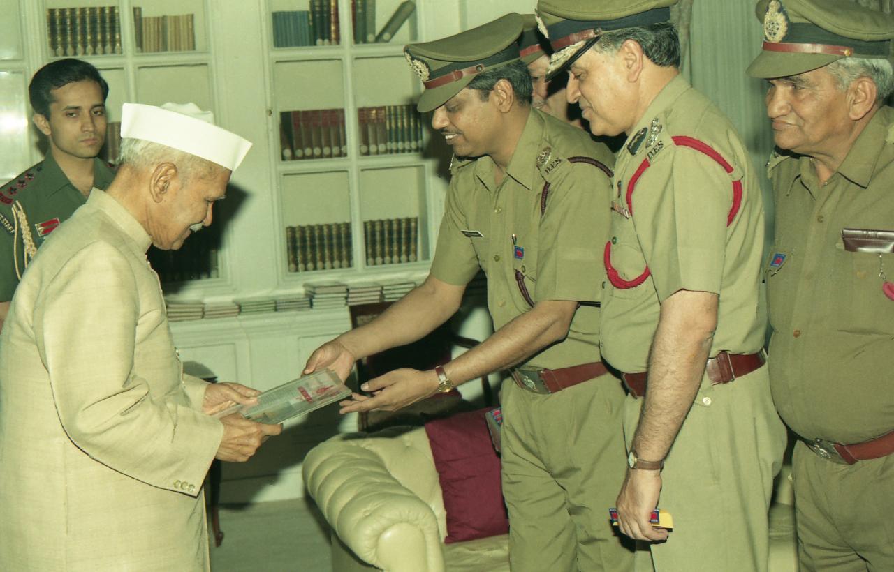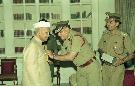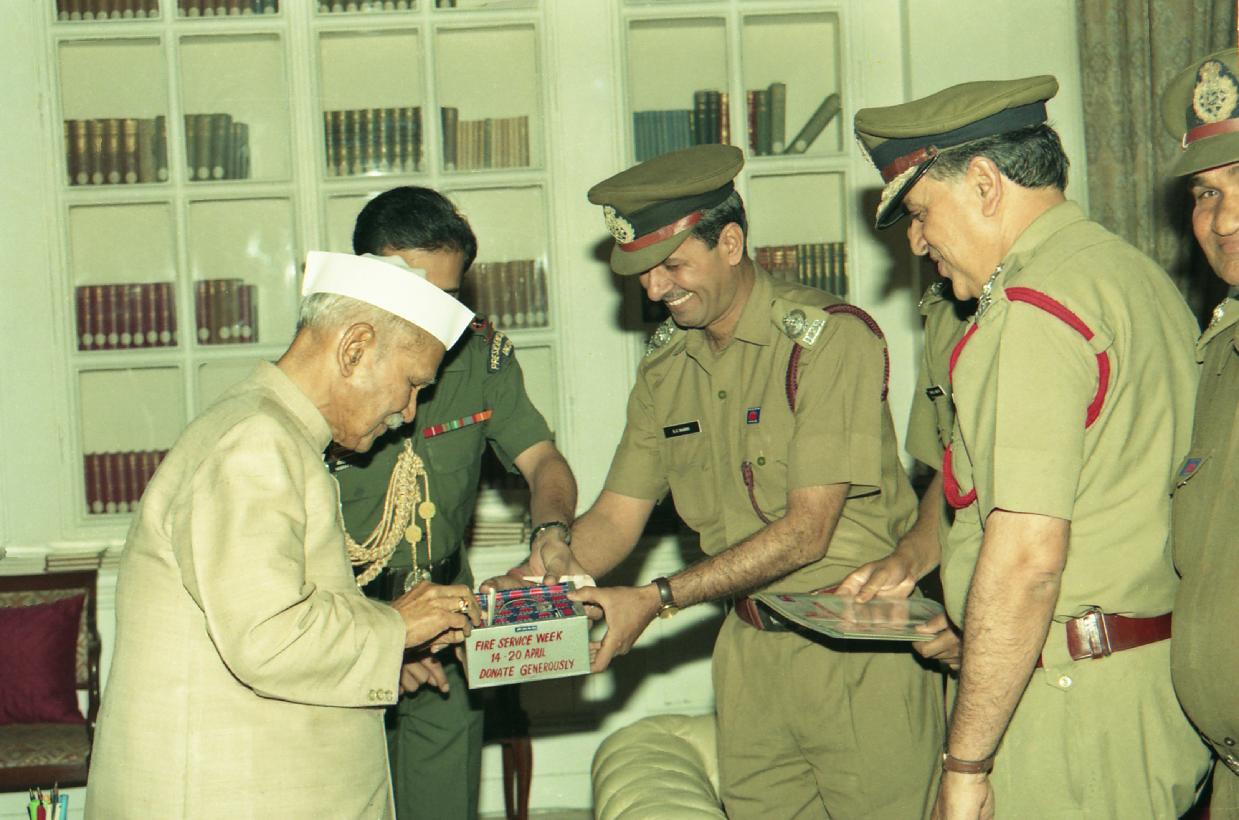 | Caption: | The President of India, Dr. Shankar Dayal Sharma being pinned a flag by the Chief Fire Officer of Delhi Fire Service on the occasion of Fire Service Week, at Rashtrapati Bhavan in New Delhi on April 19, 1997. |