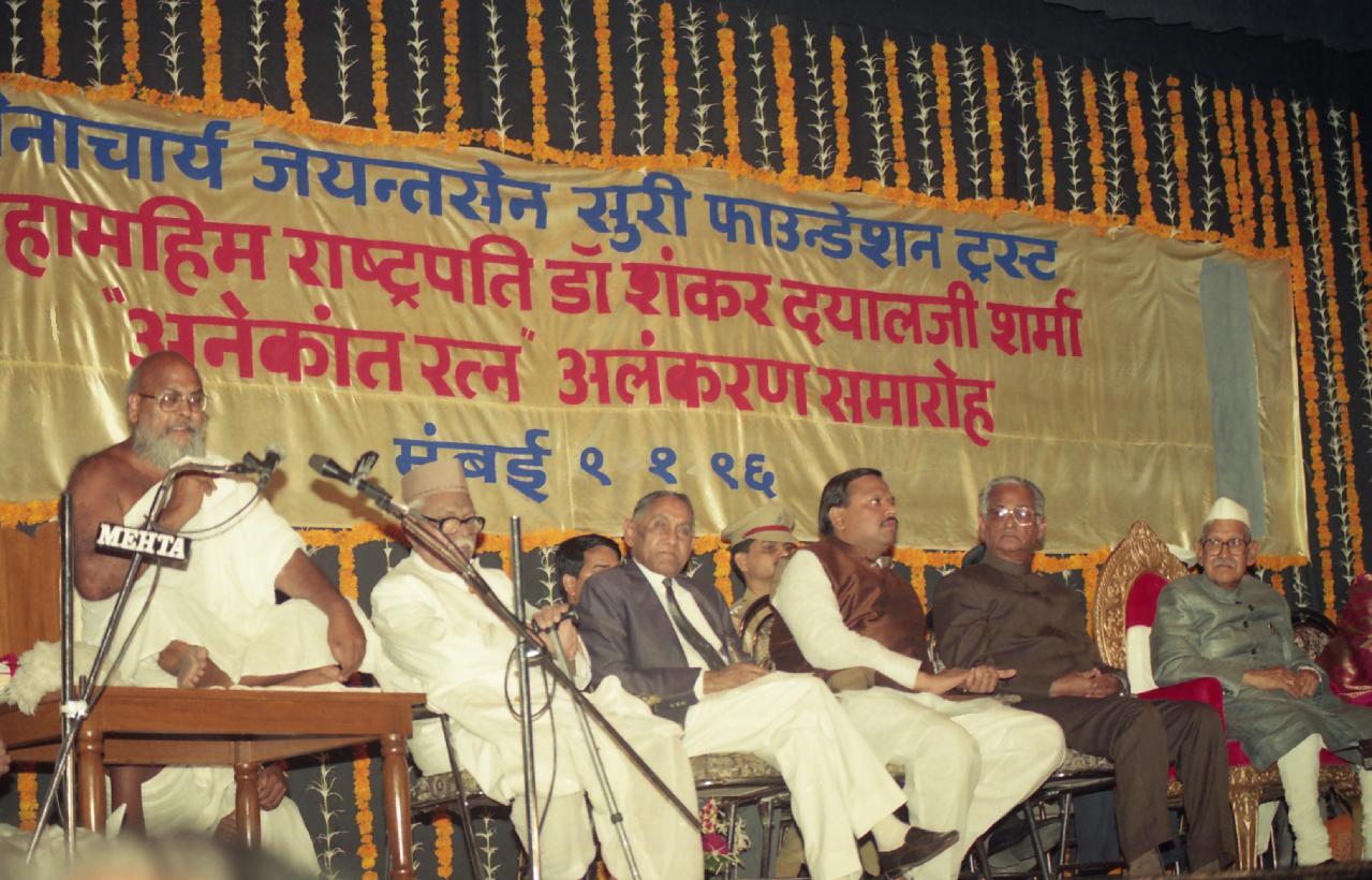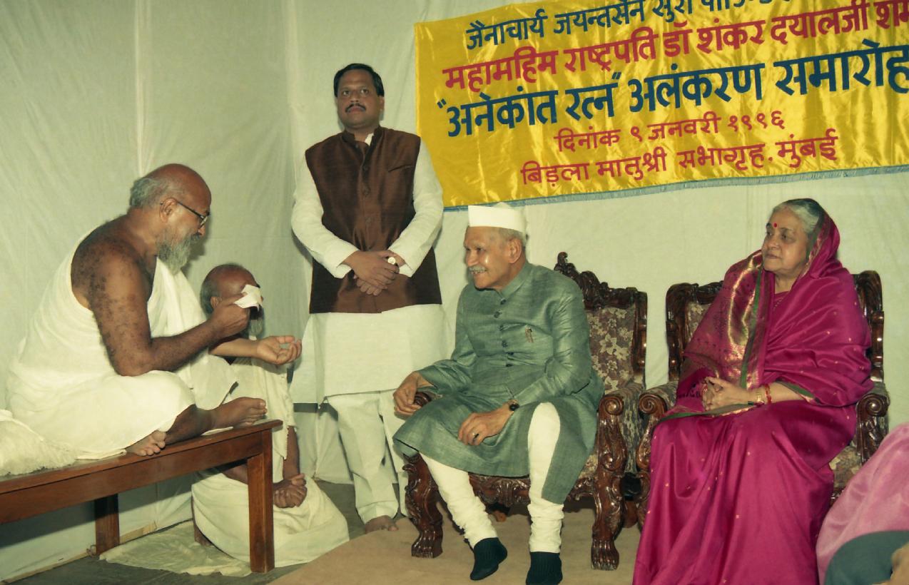 | Caption: | The President of India, Dr. Shankar Dayal Sharma meeting with Jainacharya Jayantsen Surishwarji Maharaj and receives Anekant Ratna, at the Jainacharya Jayanstsen Suri Foundation Trust Function, in Mumbai on January 09, 1996. |