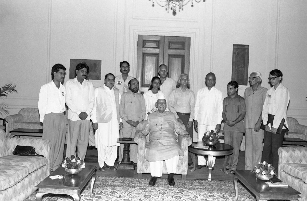 | Caption: | The President of India, Dr. Shankar Dayal Sharma receiving a copy of the book "Kharashen" of Miss Shahnaz Fatma Rashid at Rashtrapati Bhavan in New Delhi on September 08, 1994. |