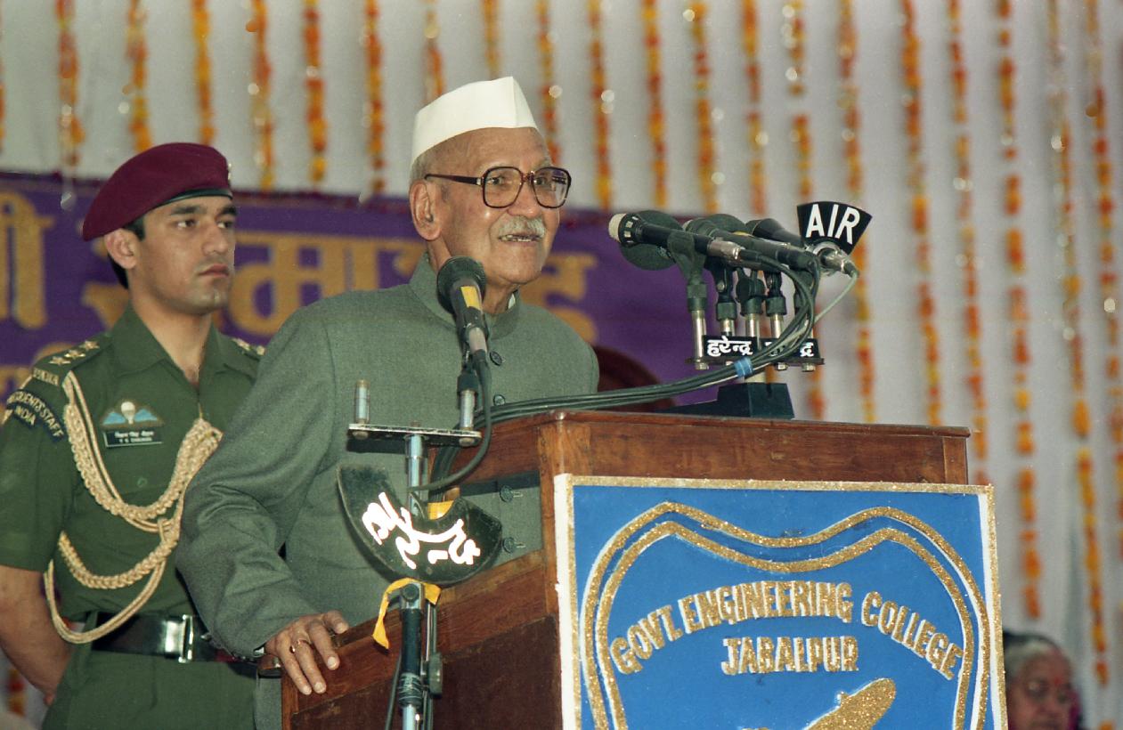 | Caption: | The President of India, Dr. Shankar Dayal Sharma addressing at the Golden Jubilee function of Government Engineering College, Jabalpur, in Madhya Pradesh on March 01, 1997. The Governor, Madhya Pradesh, Mohammad Shafi Qureshi and Chief Minister, Madhya Pradesh, Shri Digvijaya Singh are also seen. |