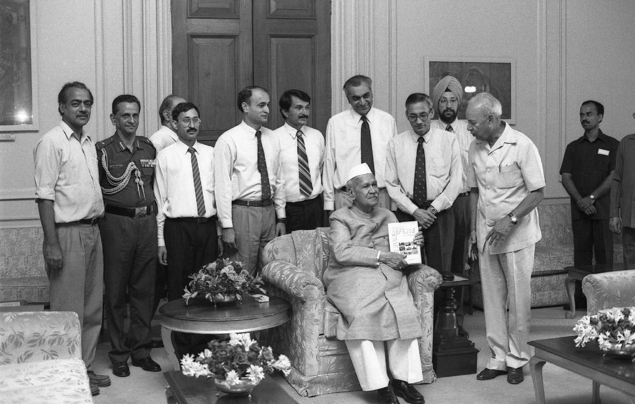 | Caption: | The President of India, Dr. Shankar Dayal Sharma receiving a copy of Book "Indian Defence Year Book 1997-98" from Lt. Gen. R.K. Jasbir Singh (Retd.) at Rashtrapati Bhavan in New Delhi on May 28, 1997 |