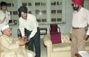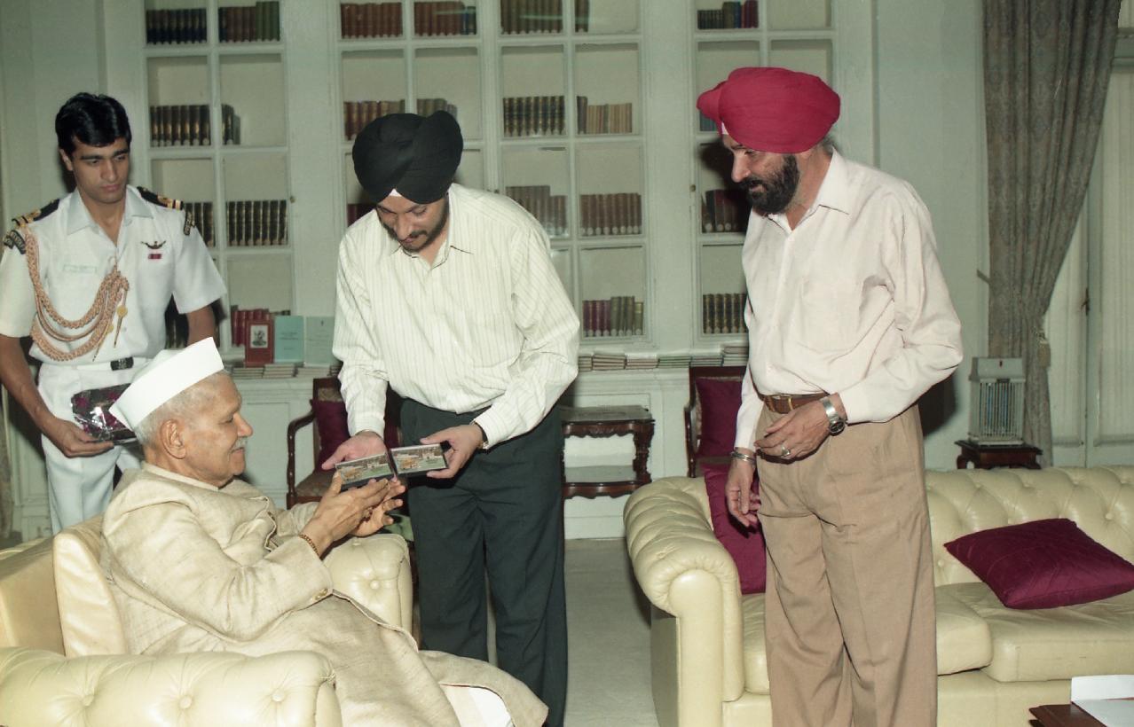 | Caption: | The President of India, Dr. Shankar Dayal Sharma receiving audio cassette "Amrit Bani" from Capt. Surjit Singh (Retd.) with Shri Bhupinder Singh Parmar at Rashtrapati Bhavan in New Delhi on May 29, 1997 |