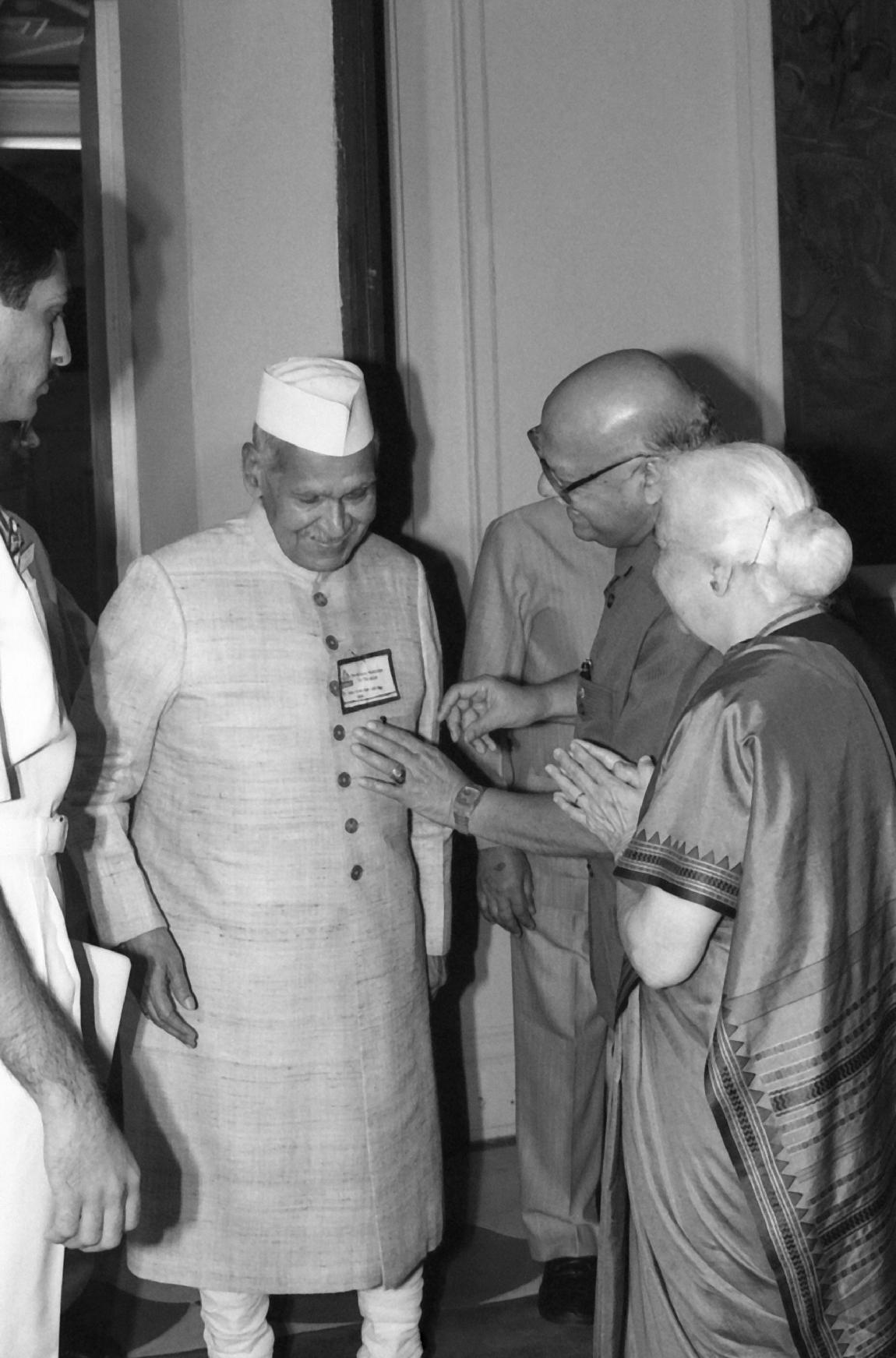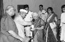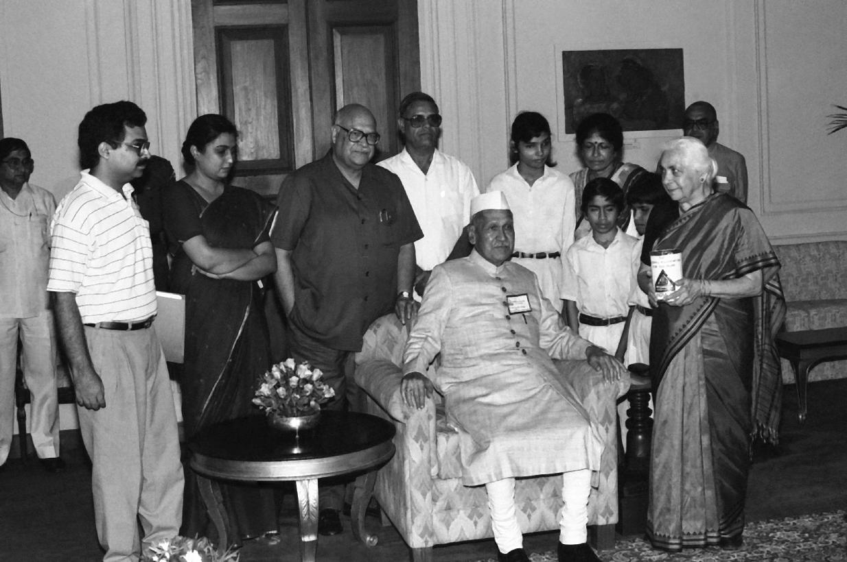 | Caption: | The President of India, Dr. Shankar Dayal Sharma being pinned a flag by the Office bearers & Children of the National Association for the Blind on the occasion of their Flag Day at Rashtrapati Bhavan in New Delhi on September 14, 1994. |