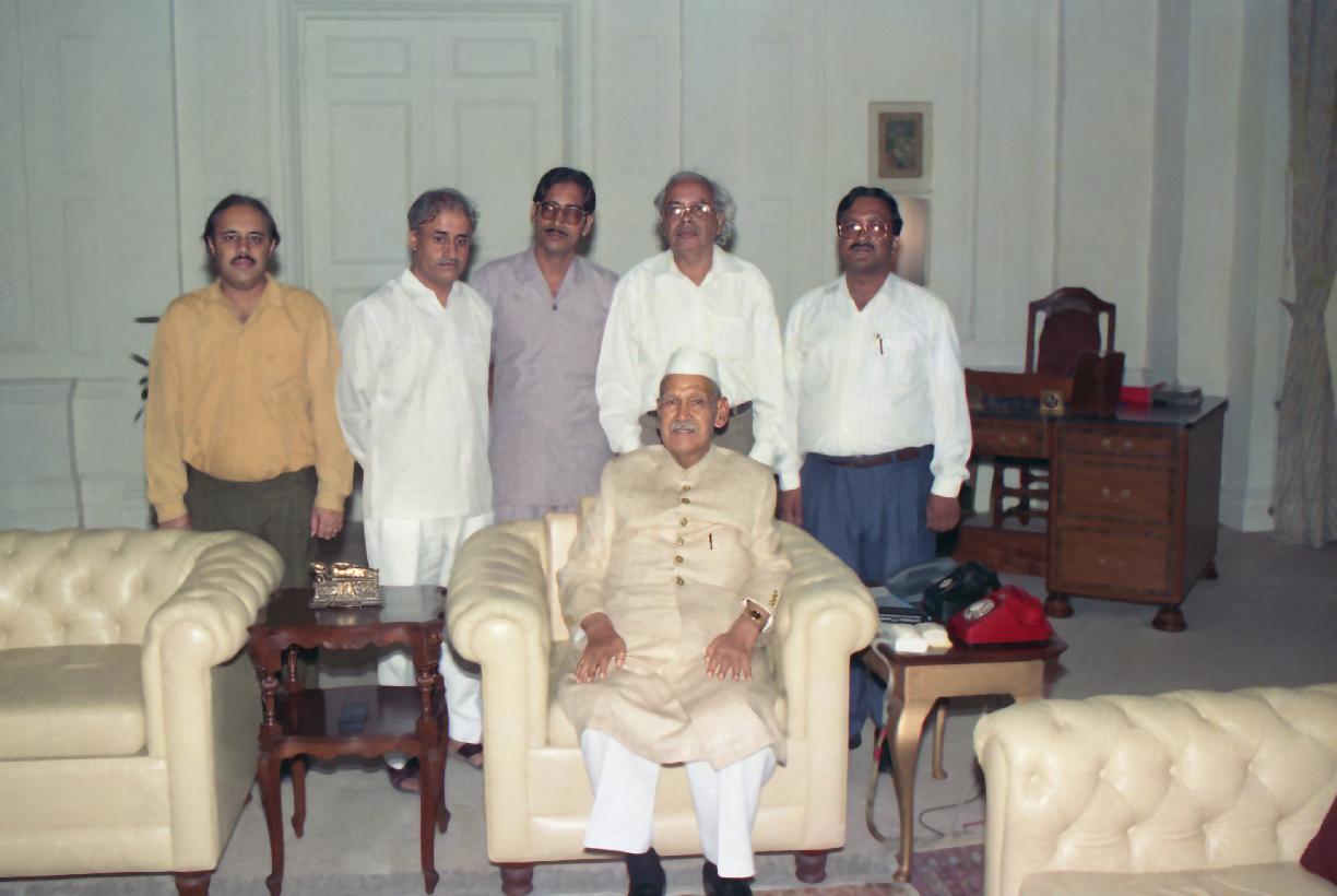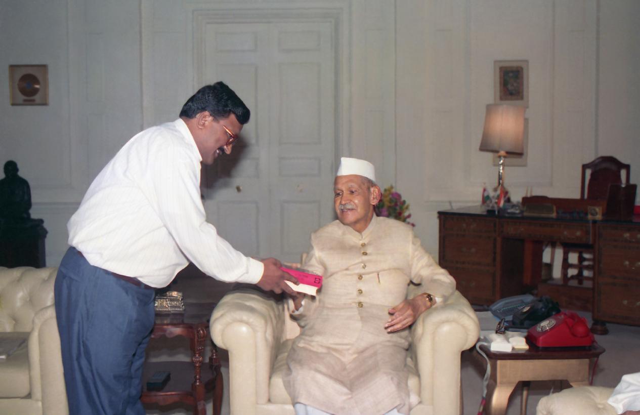 | Caption: | The President of India, Dr. Shankar Dayal Sharma receiving a copy of the book from Shri Satyabrata Sharma with others at Rashtrapati Bhavan in New Delhi on September 14, 1994. |
