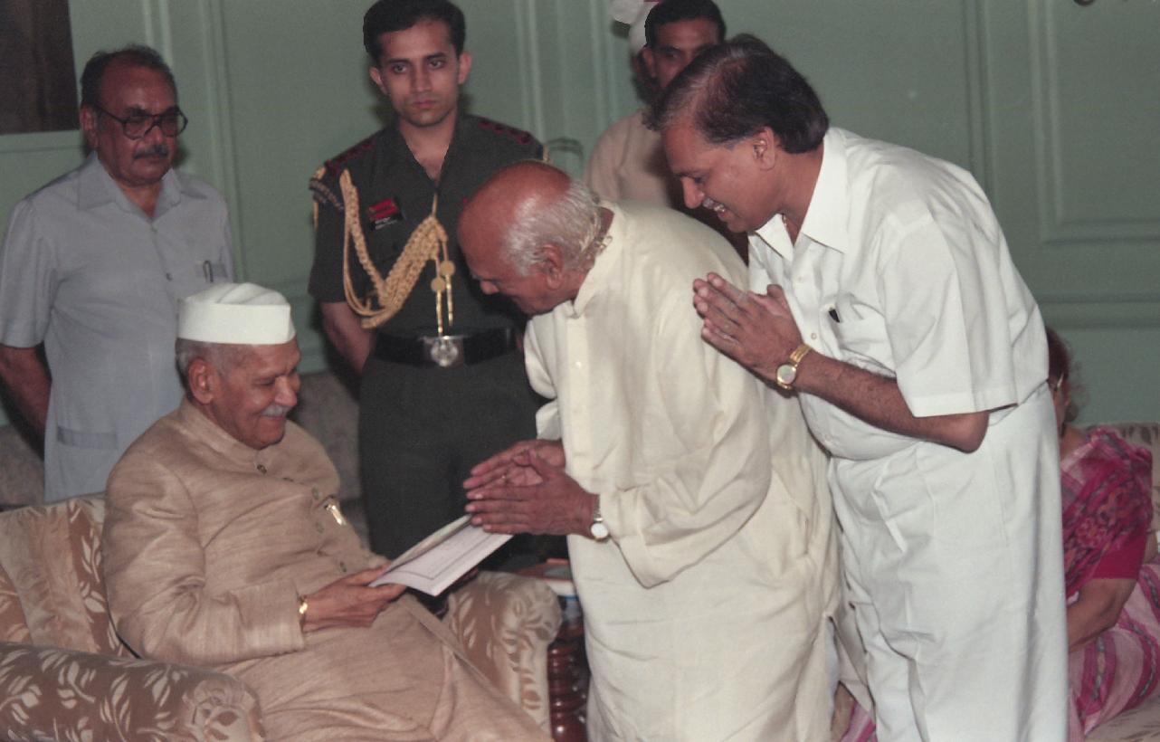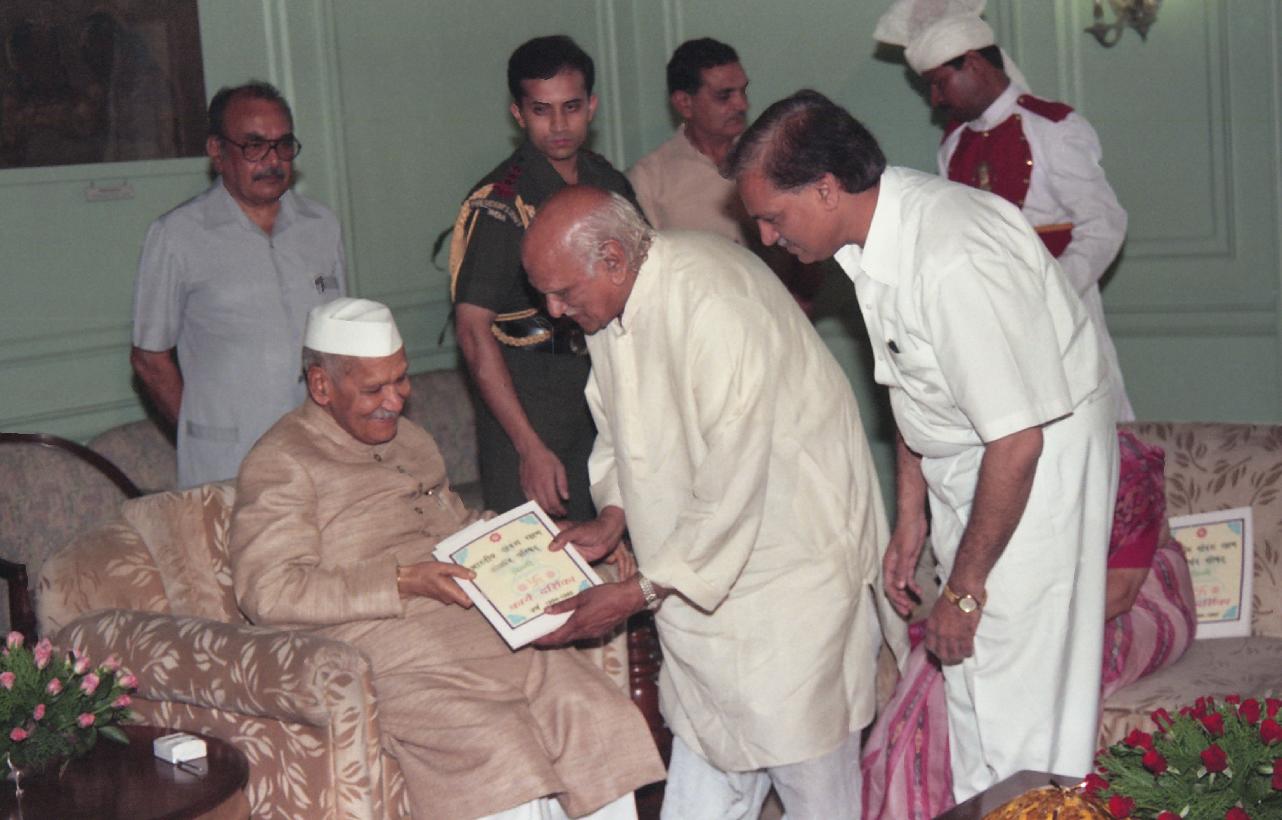 | Caption: | The President of India, Dr. Shankar Dayal Sharma receiving a copy of Biography of Lala Hardev Sahai brought out by the Bharat Gosewak Samaj at Rashtrapati Bhavan in New Delhi on July 08, 1997 |