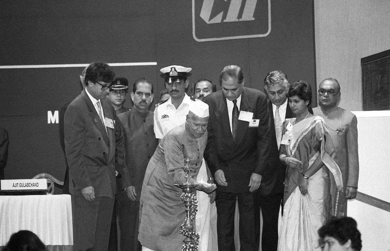 | Caption: | The President of India, Dr. Shankar Dayal Sharma lighting the lamp at the Valedictory Ceremony of the Centenary Year ''Partnership Summit 1996'' of the Confederation of Indian Industry, in Mumbai on January 10, 1996. The President also received the book ''100 Years of CII'' at the function. |