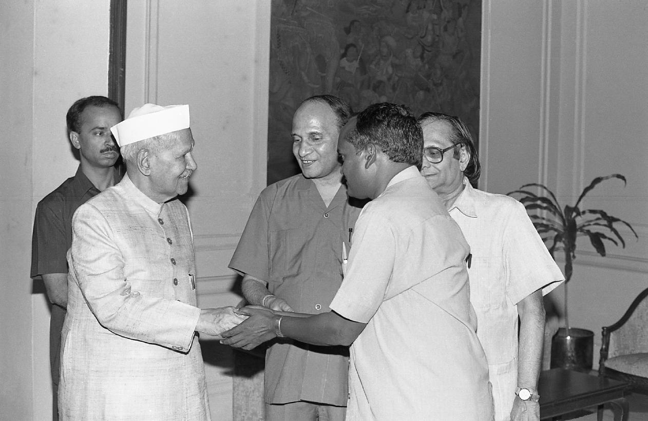 | Caption: | The President of India, Dr. Shankar Dayal Sharma receiving a copy of Book "Dekh Kabira Roya" from Dr. Bhagwati Sharan Mishra at Rashtrapati Bhavan in New Delhi on May 13, 1997 |
