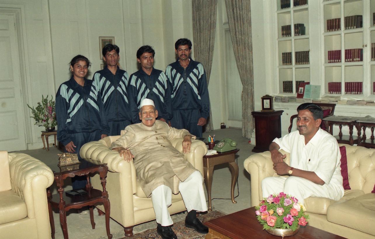 | Caption: | The President of India, Dr. Shankar Dayal Sharma meeting with Shri C. Narayanswami alongwith students at Rashtrapati Bhavan in New Delhi on May 13, 1997 |