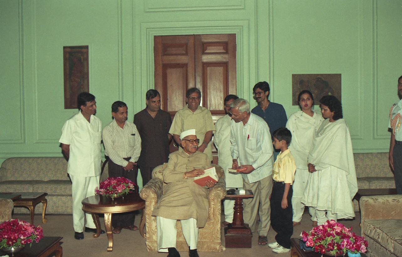 | Caption: | The President of India, Dr. Shankar Dayal Sharma receiving a copy of Book "Hindi Patrakarita Ka Vrihad Itihas" from Dr. Arjun Tiwari at Rashtrapati Bhavan in New Delhi on May 20, 1997 |