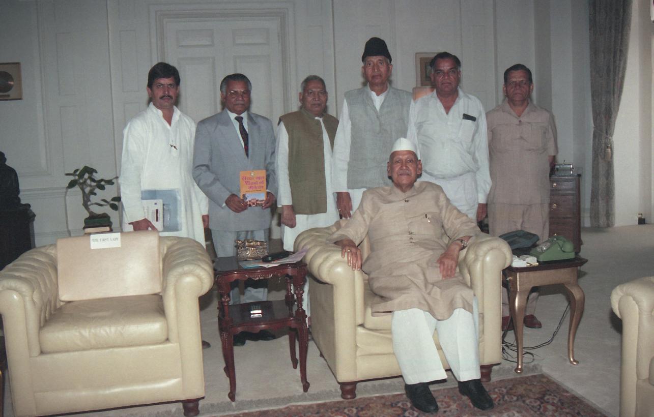 | Caption: | The President of India, Dr. Shankar Dayal Sharma receiving a copy of the book "Sardar School Shatabdi Varsh Mahotsav" from Shri Nathuram Mirdha with others at Rashtrapati Bhavan in New Delhi on November 01, 1995. |