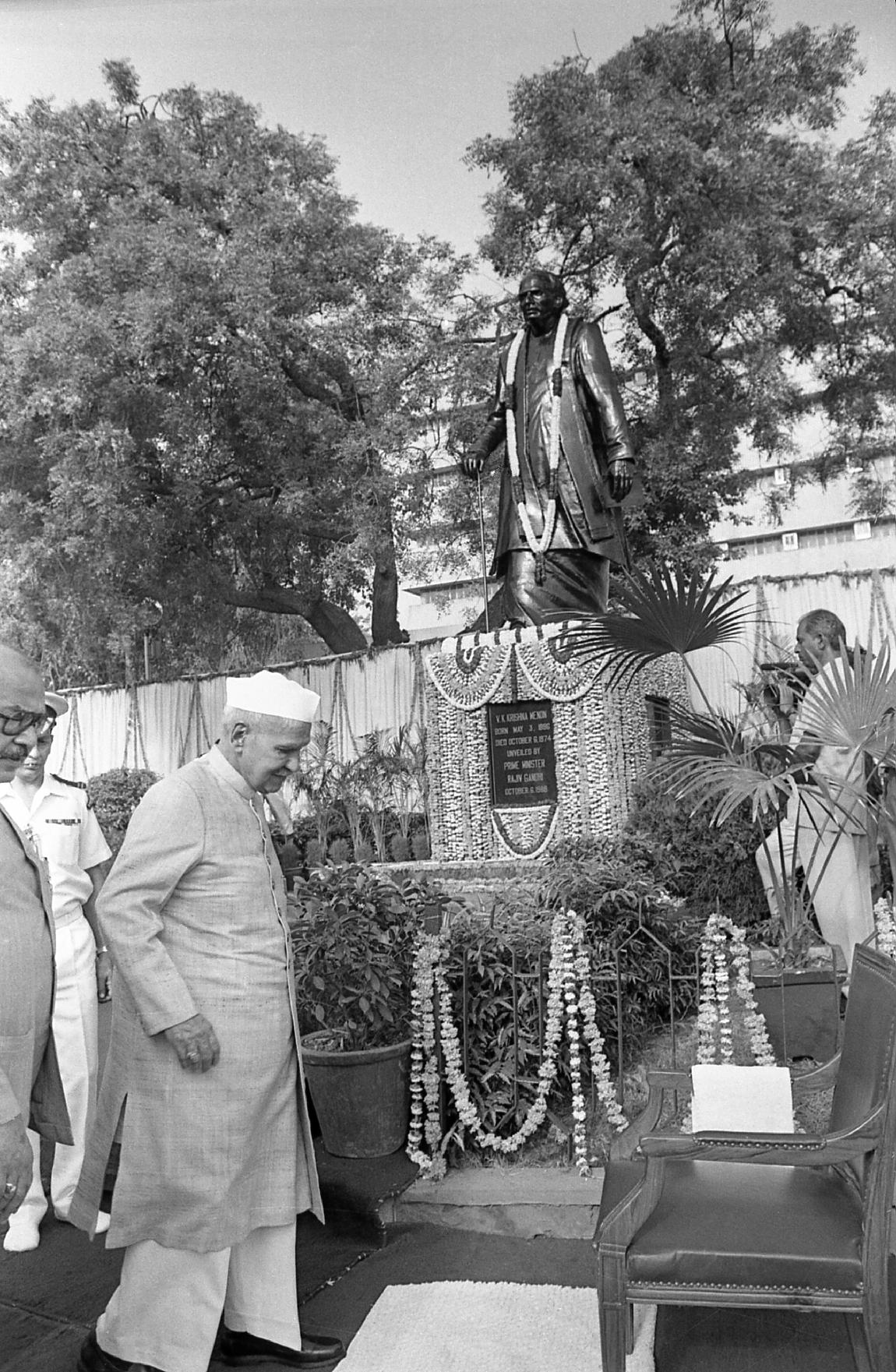 | Caption: | The President of India, Dr. Shankar Dayal Sharma garlanded at the statue of Shri V.K. Krishna Menon on his 101st birth anniversary, in New Delhi on May 03, 1997. |
