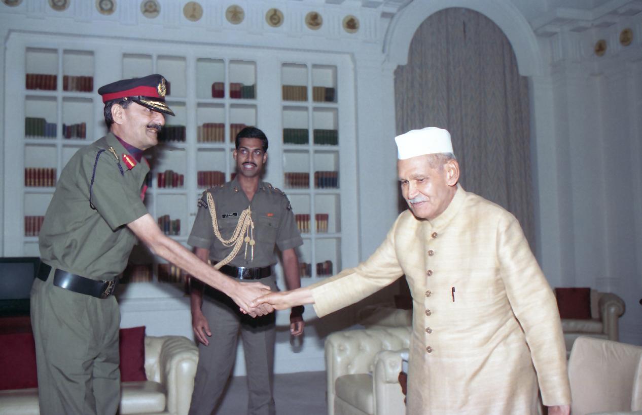 | Caption: | The President of India, Dr. Shankar Dayal Sharma meeting with Maj. Gen. A.V. Sathe at Rashtrapati Bhavan in New Delhi on September 15, 1994. |