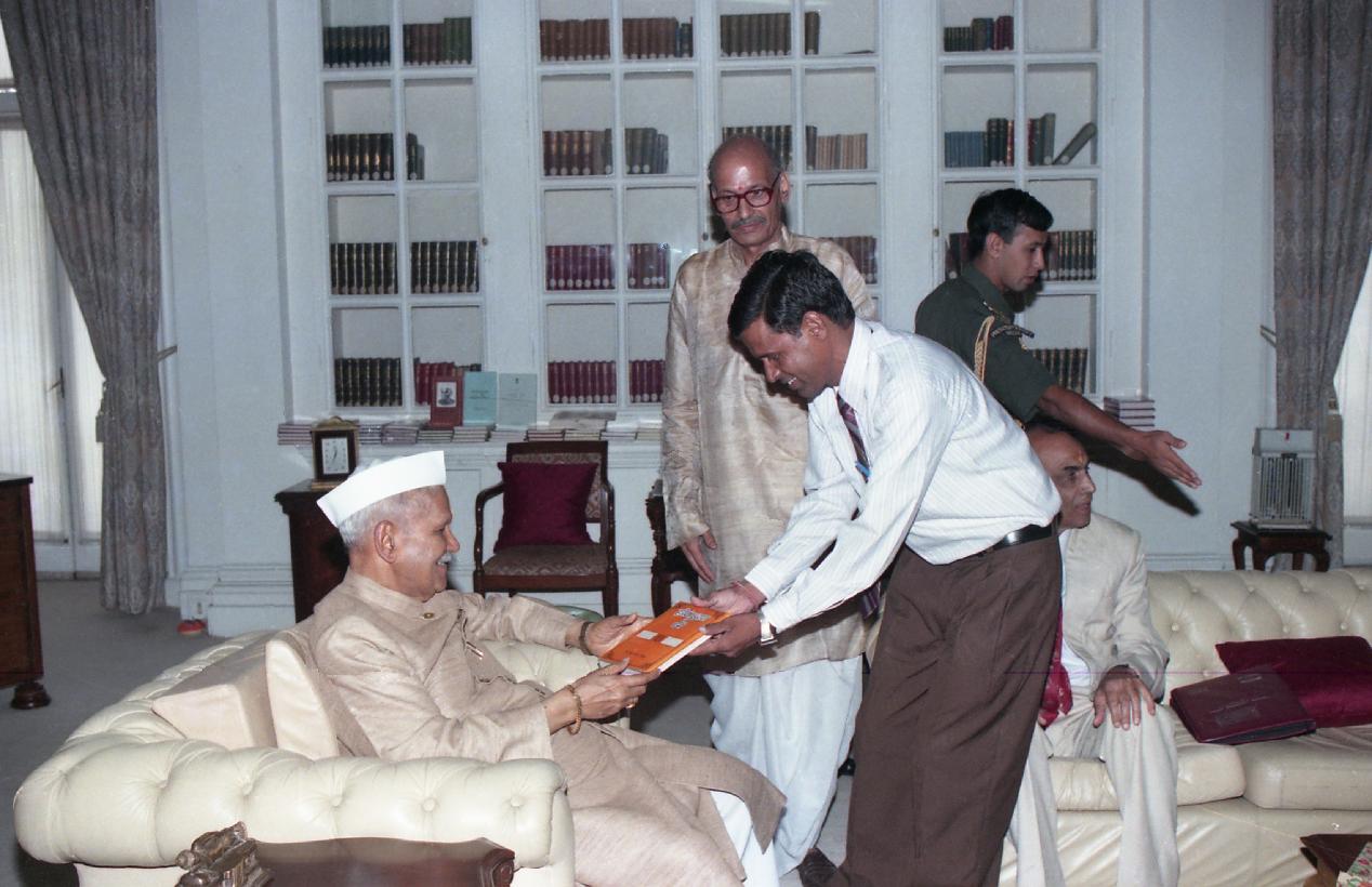 | Caption: | The President of India, Dr. Shankar Dayal Sharma meeting with Dr. Om Prakash Nikhra with others at Rashtrapati Bhavan in New Delhi on June 10, 1997. |