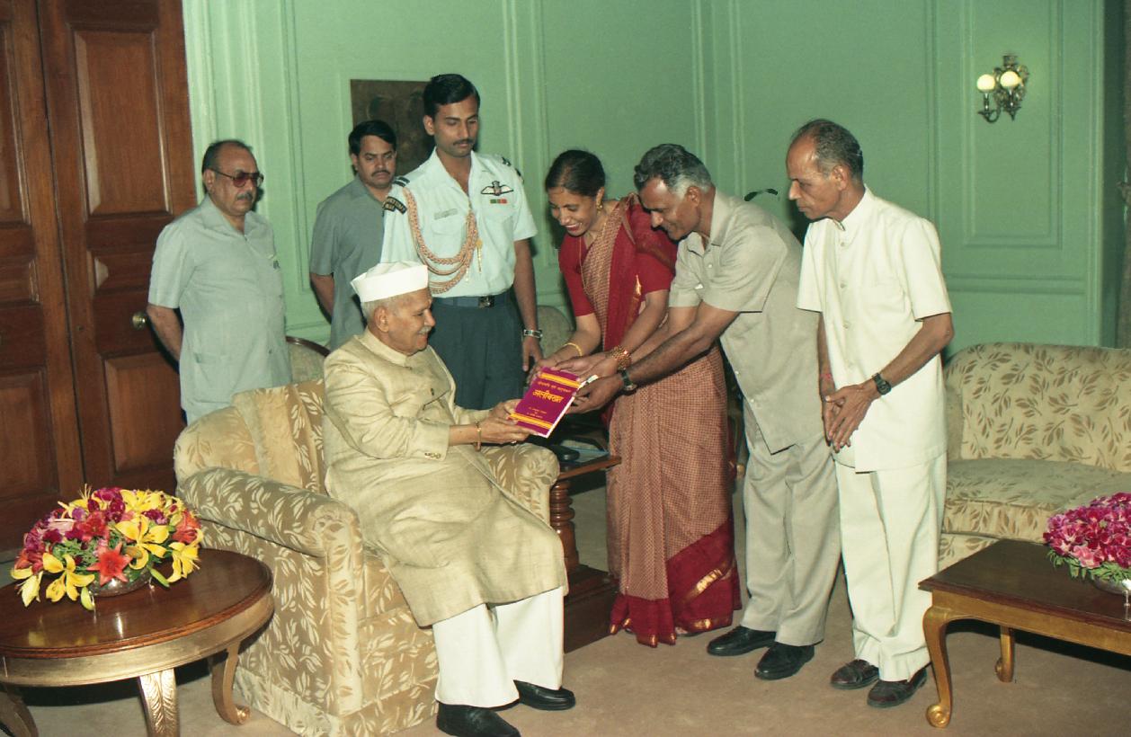 | Caption: | The President of India, Dr. Shankar Dayal Sharma receiving a copy of Book "Lok Kavi Evam Natyakar Alibuksh" from Dr. Ram Kumar Bhardwaj & Dr. Anita Bhardwaj at Rashtrapati Bhavan in New Delhi on June 06, 1997. |