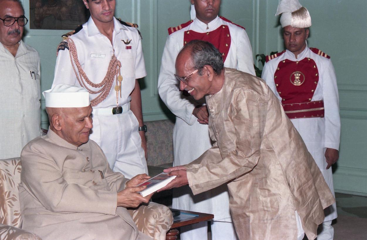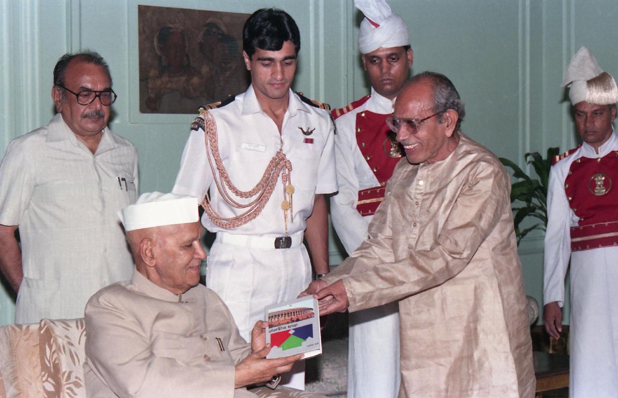 | Caption: | The President of India, Dr. Shankar Dayal Sharma receiving a copy of Book "Sansadiya Dhara" from Shri Ganesh Datt Chaturvedi at Rashtrapati Bhavan in New Delhi on July 19, 1997 |