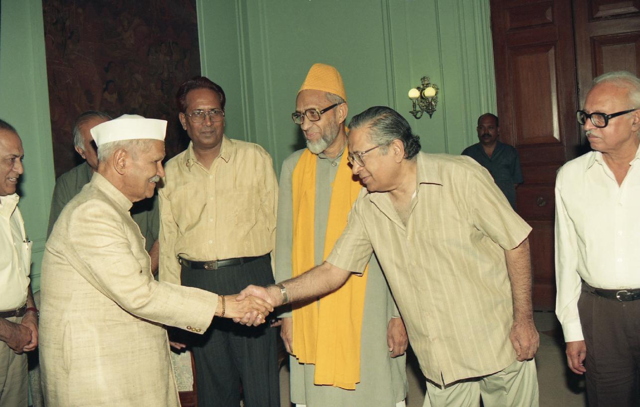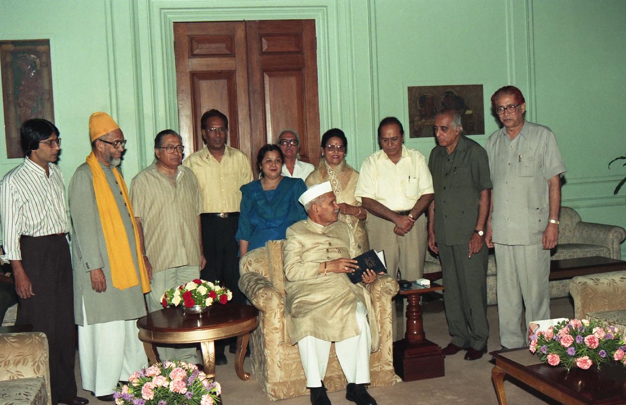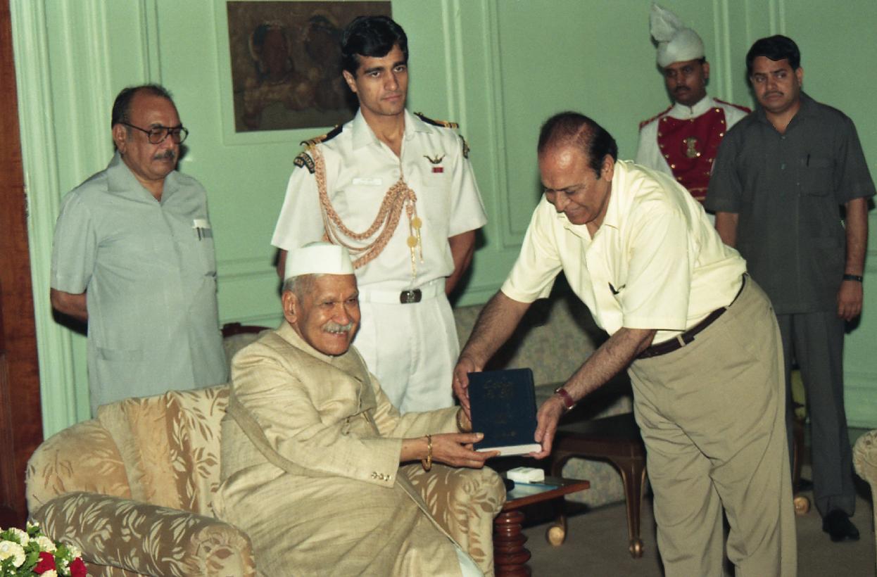 | Caption: | The President of India, Dr. Shankar Dayal Sharma receiving a copy of Book "Hindustan Ke Urdu Musaniffin Aur Shuara" from Prof. Gopi Chand Narang at Rashtrapati Bhavan in New Delhi on June 19, 1997. |