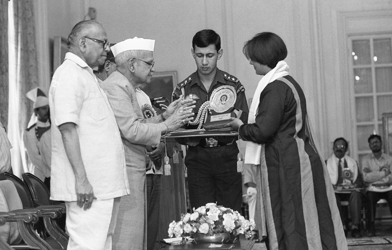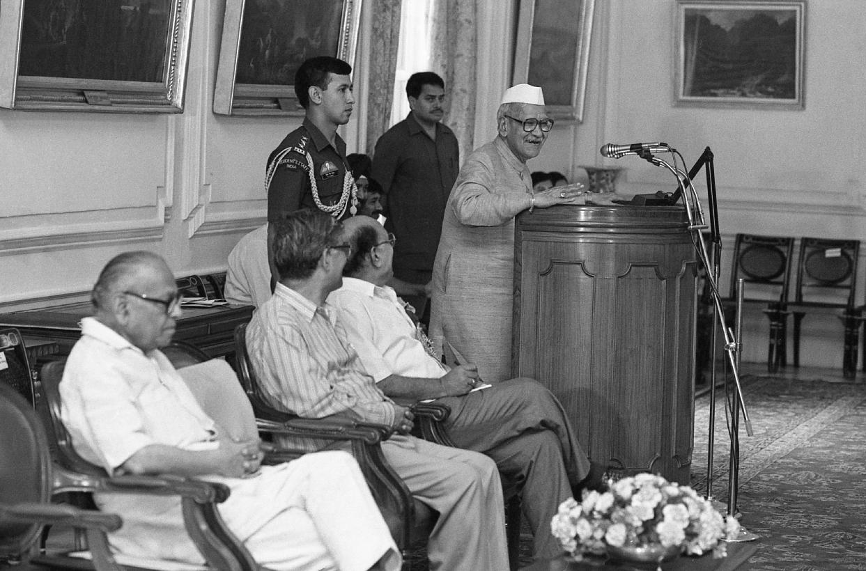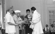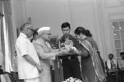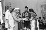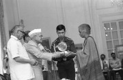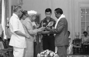 | Caption: | The President of India, Dr. Shankar Dayal Sharma presenting awards to non-Hindi speaking Hindi writers at Rashtrapati Bhavan in New Delhi on June 20, 1997. |