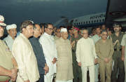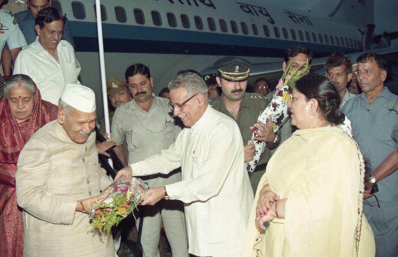| Caption: | The President of India, Dr. Shankar Dayal Sharma being received by the Governor, Madhya Pradesh, Mohammad Shafi Qureshi and Chief Minister, Madhya Pradesh, Shri Digvijaya Singh, at Indore airport on June 27, 1997. |